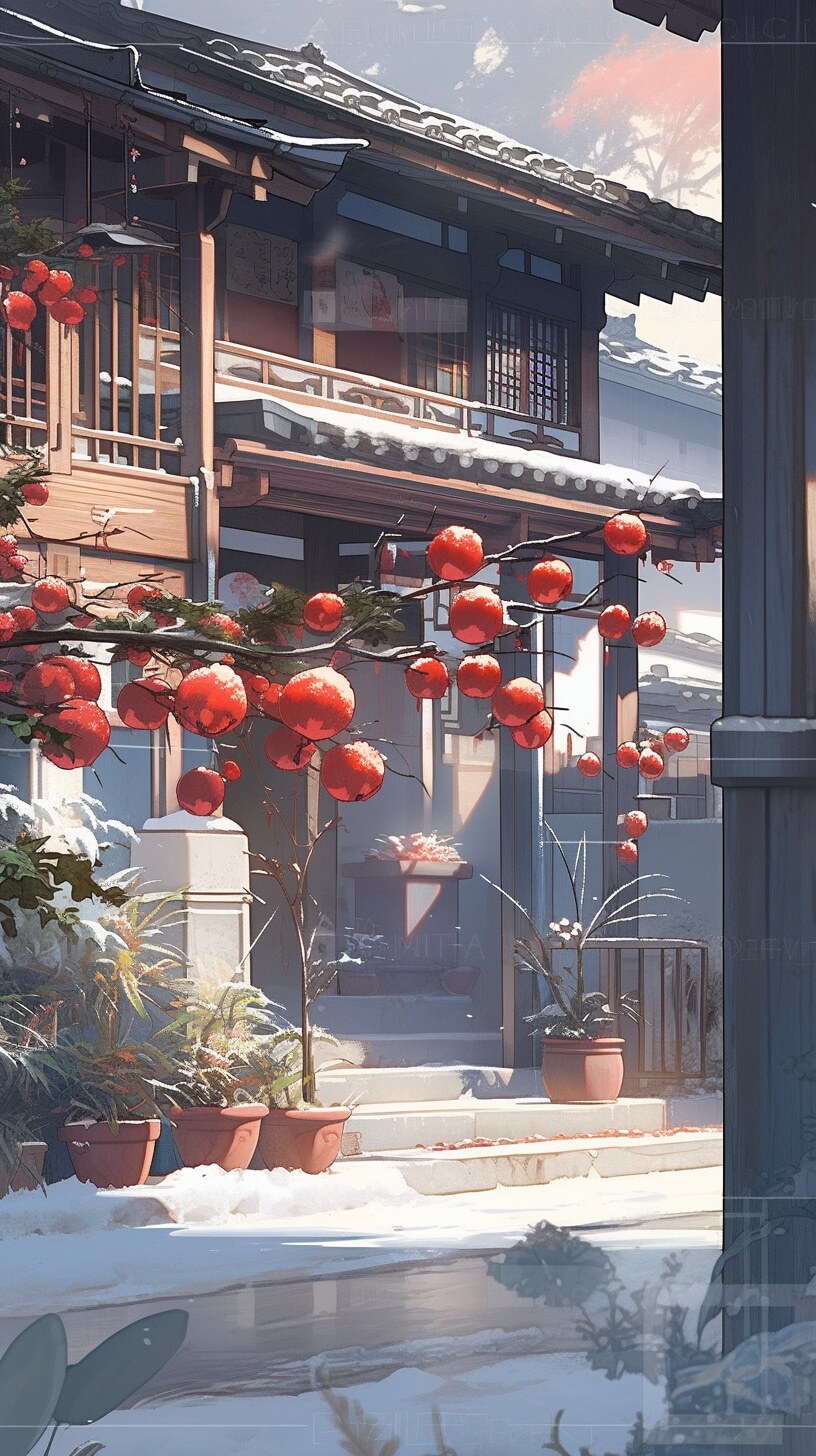 Photo, white background, Chinese landscape, heavy snow, Chinese pure white Hui-style architecture courtyard, white wall, a persimmon tree hanging high on the wall of the courtyard, hung with red persimmons, covered with snow. route. View from outside the fence. The traditional rural landscape is quiet, beautiful, high in detail, soft moonlight, soft color, soft light, 8k, new happiness, deep details, level of detail, high quality, high definition, new love rendering, high definition(点击复制)
