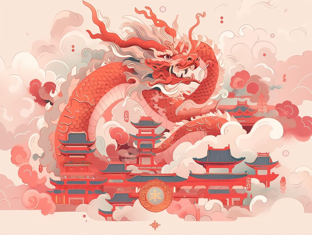 平面插图,中国龙在云端盘旋,下方是中国唐代 建筑,红色背景,极简主义,想象力,异想天开 的,个性鲜明的插画风格,喜庆的,中国新年,高画质,细节清晰,大场景,