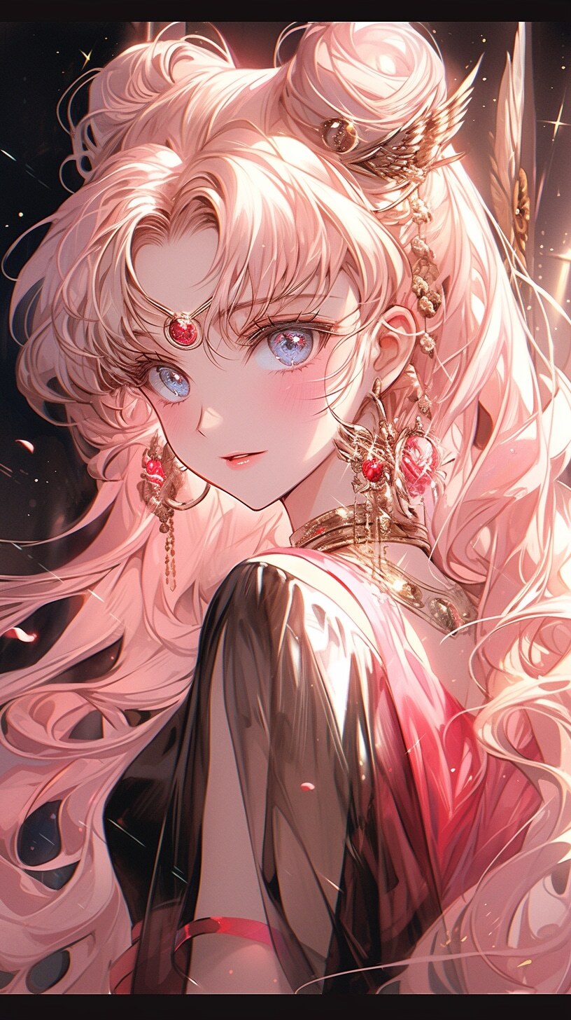 a photo of a sailor moon with long hair and a crescent moon, in the style of darkly romantic illustrations, elegant, emotive faces, light bronze and light pink, nightcore, elaborate costumes, dark white and dark pink, close-up --ar 27:32(点击复制)