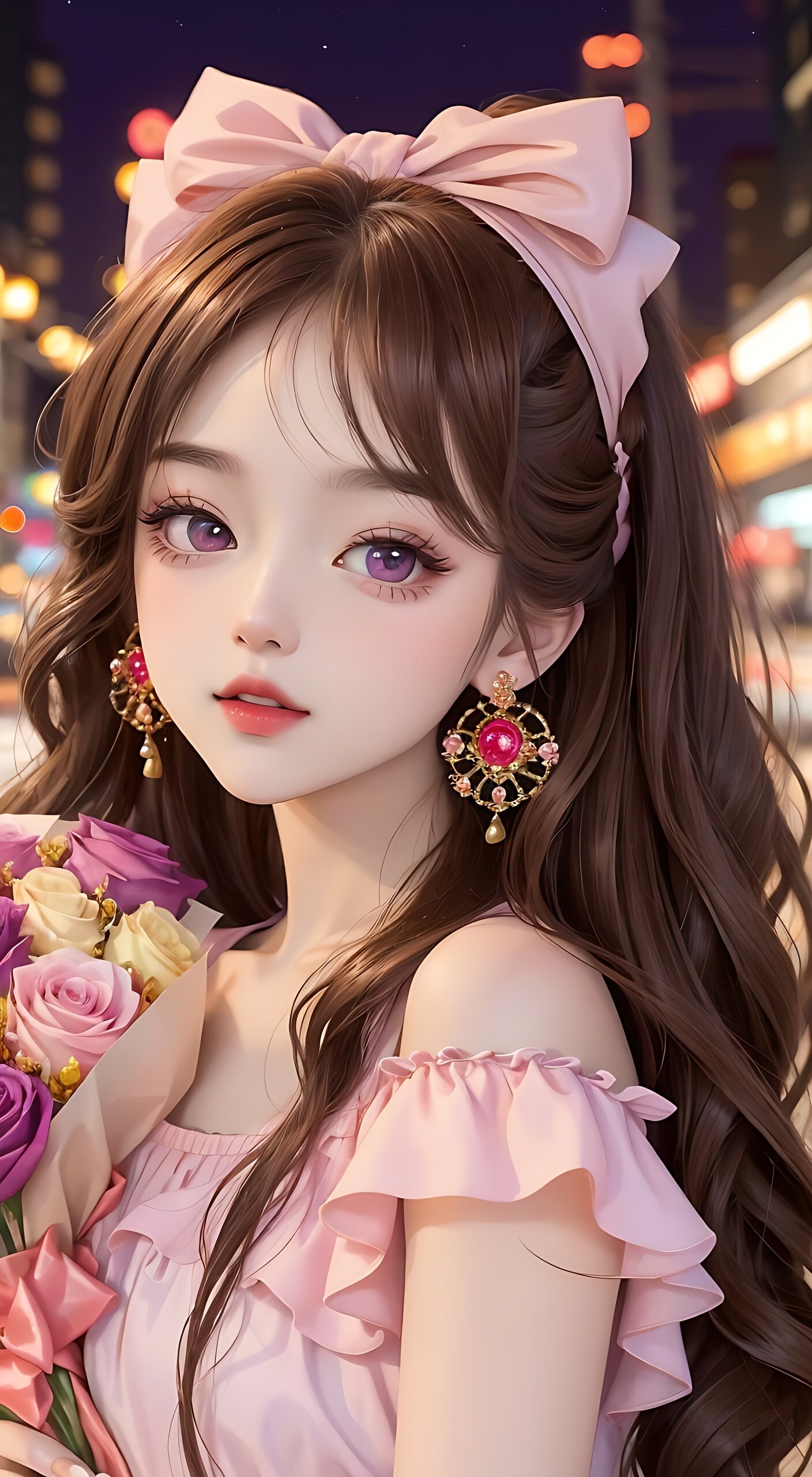 高清,夜晚,1个甜美女孩,身子微侧,眼睛看向正前方,大大的眼睛,长长的睫毛,樱桃小嘴,棕色长长的头发,漂亮发饰,漂亮耳饰,粉紫色上衣,街道,灯光,半身照,抱着玫瑰花束