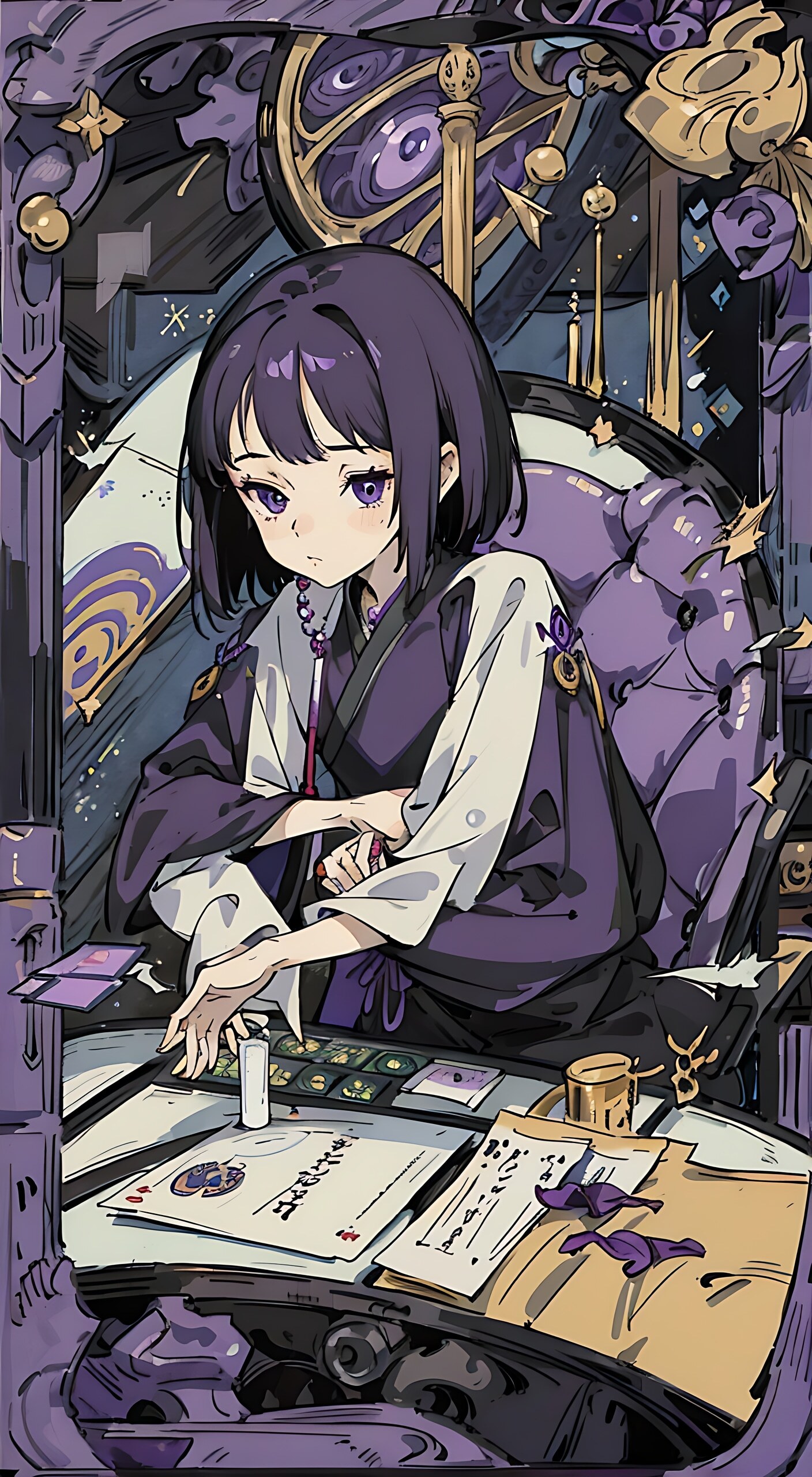女巫,女生,卡姿兰大眼睛,紫黑配色,短发,扑克牌元素,