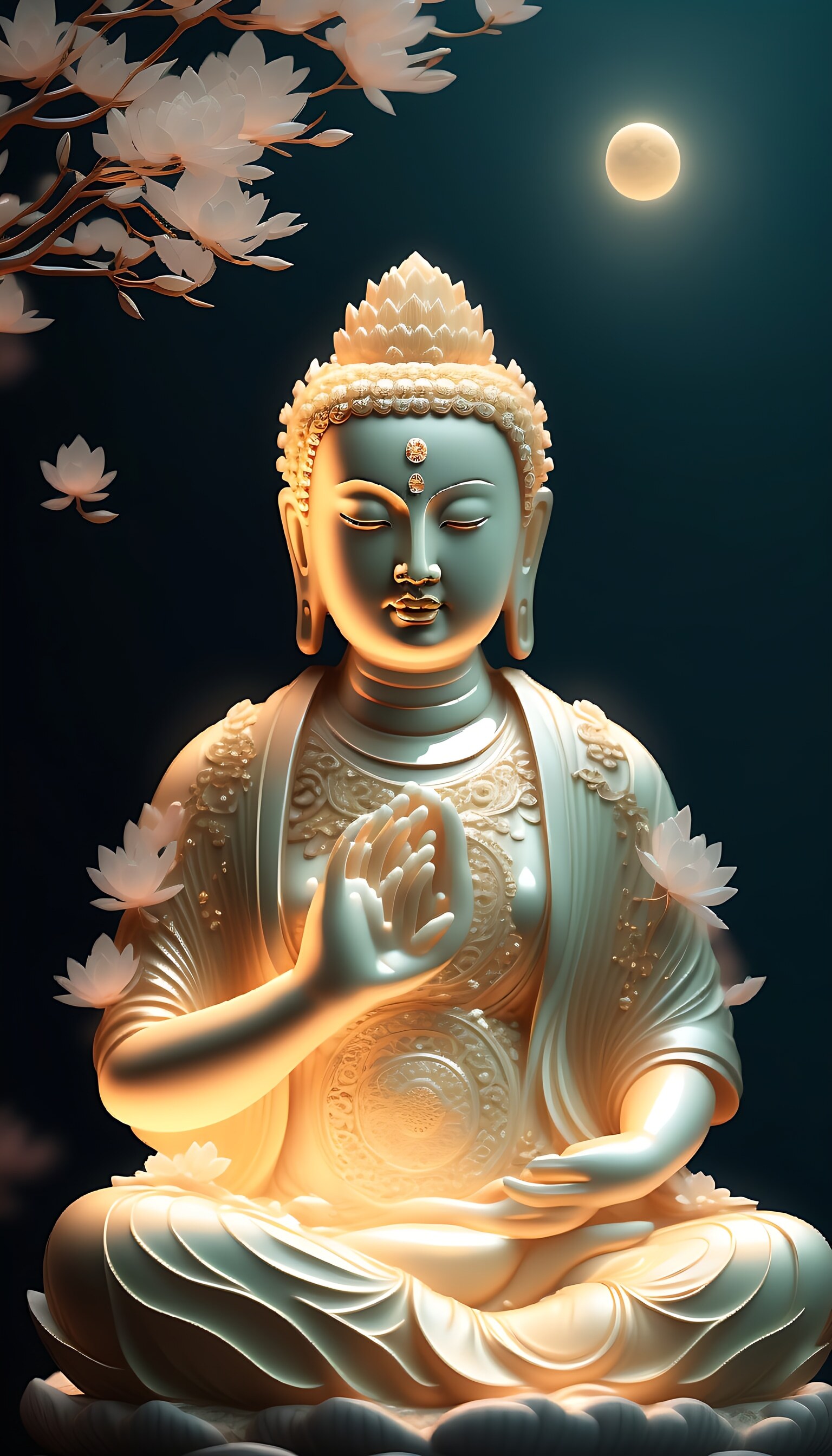 日月,如来佛祖,华丽衣服,头后光,日月星辰,花香,禅意, 正面全身,正对面,广角,高雅,超高清,超复杂细节,超真实