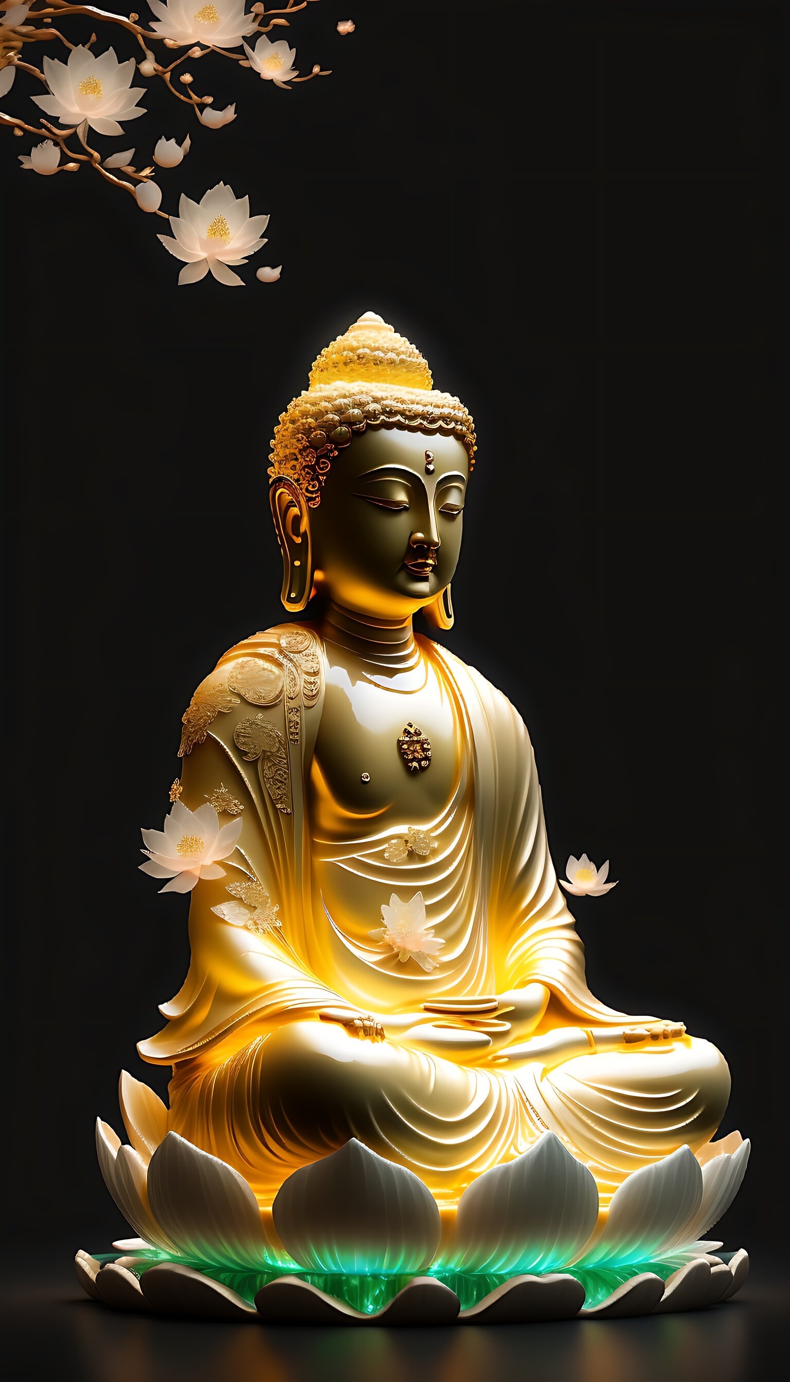 如来佛祖,金光闪闪,面对着我,金色衣服,手拿水晶莲花,头顶光环,坐在正中央,背景是星空,淡淡的金莲晶莹剔透,挑剔,花心像萤火虫,花瓣是五彩的,很漂亮,Octane渲染,高质量,复杂的细节,超广角镜头,体积光,8K ,v1