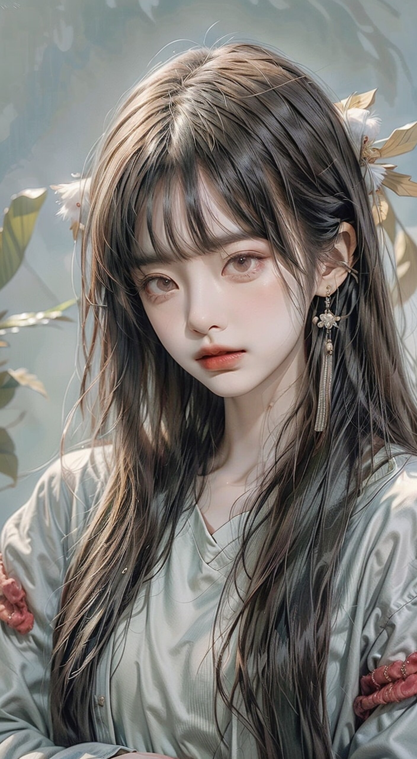 宫崎骏一个女孩,近景,刘海,洽着端午粽子发卡,精致的五官,(五彩蓬松的波浪头发),褐色的眼睛,睫毛,红唇,看着观众,化妆,肖像,(有光泽的皮肤),纯洁,solo,((精致的蓝灰色上衣)),((精致的绿色耳环)),可爱,简单背景,白色背景,(杰作:1.4),(最佳质量:1.4)完整头像,(背景留白,构图完美),时尚女孩,全身