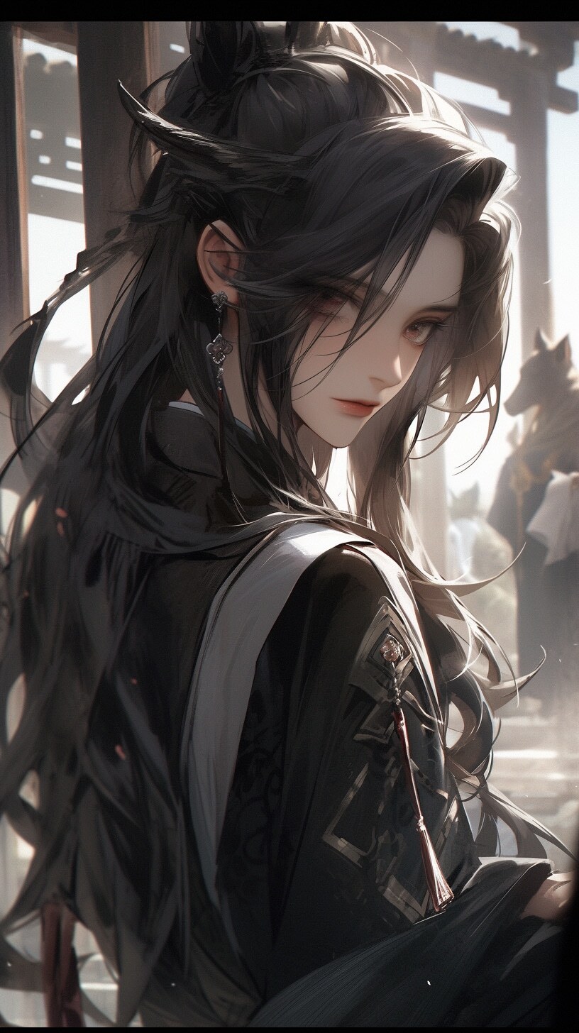 东方男孩,一个18岁的张静娜风格的动漫男,有着男女不分雌雄莫辨的脸,长发飘飘,受中国古代艺术的影响,黑色长发,金色头发配饰,白色唐朝服装,中国花园的背景,中国风格的建筑,简单的白色背景,漏光,深白和灰色,传统油画,疯狂的面部特写,神秘的美,千变万化的核心,强烈的特写,自然的风格,高冷,优雅,英俊,高贵的个性。细节丰富,非常精致。