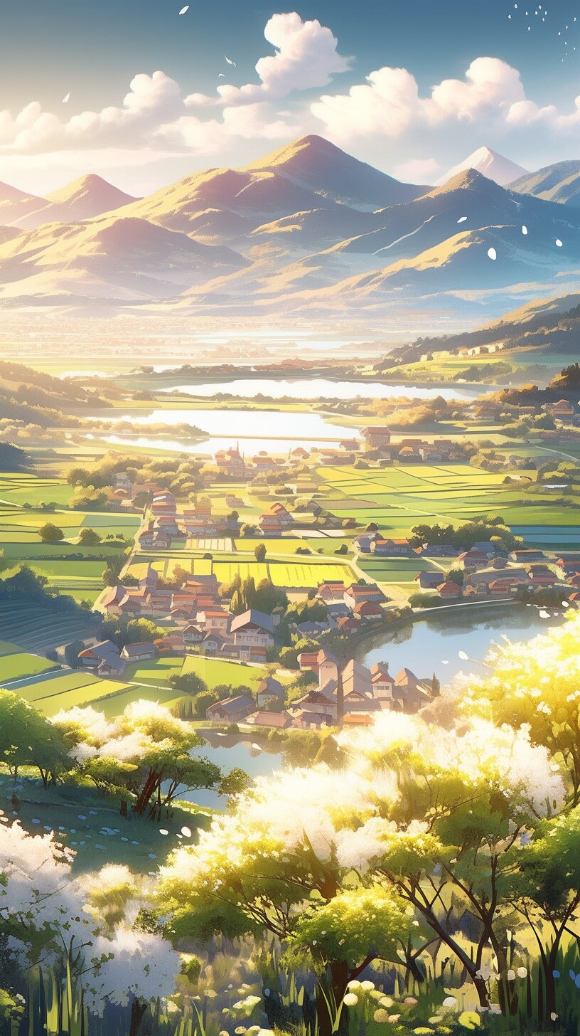 春天,阳光明媚,梯田上开满了油菜花,远处是一个模糊的小村庄,桃树盛开,水面如镜,真实的镜头,大师级杰作,8K高清,3D渲染,超真实,超详细,