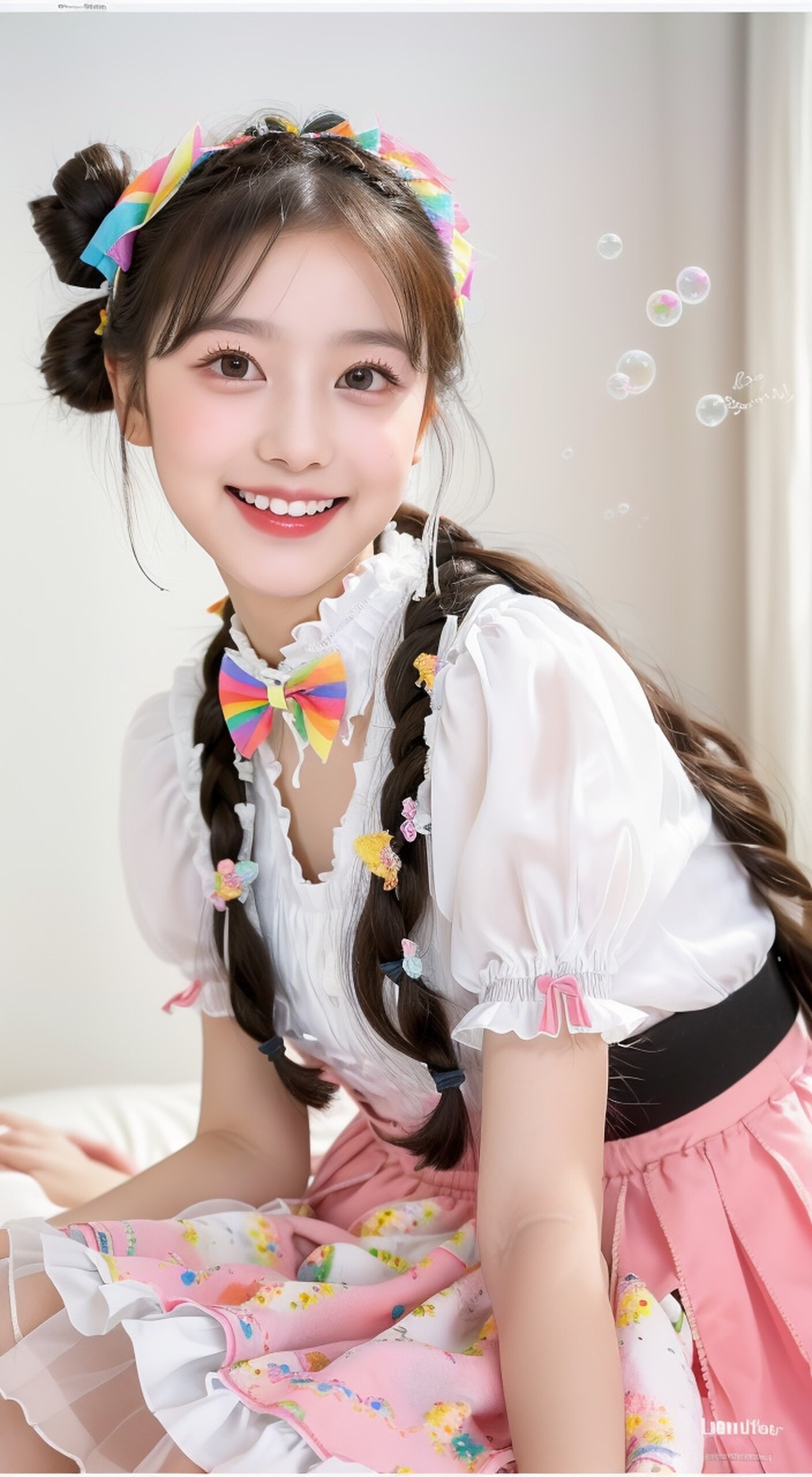 高细节,8k分辨率,超高分辨率,一个稚可爱的清纯甜美少女,(((高领结))),((彩虹色麻花辫子侧高双马尾)),双发髻,彩色清澈眼眸,顺滑的长发,锁骨,精致完美的五官,清澈明亮的眼睛,长长的睫毛,眼睛甜美有卧蚕,甜美的笑容,长空气,纹理清晰,线条流畅,高质量,壁纸,面部详细描写,动态追踪,极致画质,最高精度,精确完美的人体结构,全身镜头,彩虹色高领((洛丽塔款式泡泡袖长款裙)),((蓬蓬裙洛丽塔风格)),(((穿插混搭设计))),(洛丽塔发饰),洛丽塔项圈,洛丽塔头饰,洛丽塔防晒伞,卧室里边侧身坐着,完美的腿,(萝莉脸),(萝莉身),软妹,萌妹,萝莉控,萝莉养成,(萝莉音),(萝莉酱),萝莉纯欲,小短腿,黑色长袜,玛丽珍鞋,(撒娇的眼神),身材娇小可爱,(撒娇的萝莉),娇滴滴,笑盈盈的萝莉女孩,(纹理清晰),清晰可见,(描写详细),皮肤白嫩细腻有光泽,骨骼发育良好,毛孔细腻,皮肤白嫩,身材比例完美,光线追踪,多巴胺穿搭,穿搭达人,光照脸部,电影极光照,渲染,舒适的环境,耳坠,面向观者,微妆容,美瞳,发际线高,裁剪整齐的齐眉刘海,站在图片中间,深红色和绿色穿插搭配的设计,微距镜头,详细!风格多变,(超现实照片),胸部特写,耳环,项链,丝带(点击复制)