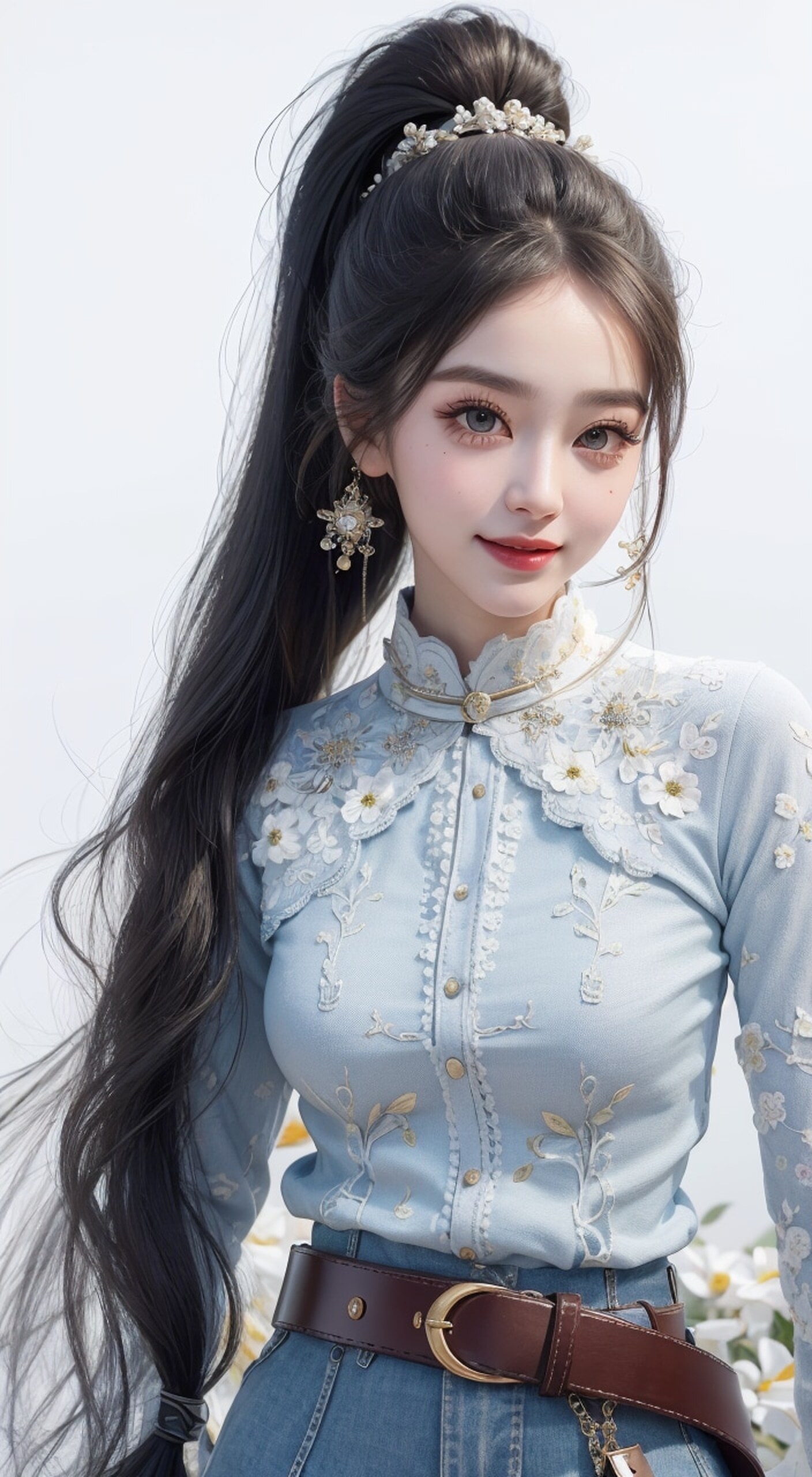 大眼睛,眼睛很大,长睫毛,(((长头发,高马尾))),可爱的美女,脸部细节,脸部增强,皮肤很白,精致的五官,美女,(((细腰带))),时尚,微笑,纯色花海做背景,完美的曲线身材,无限细节,超高分辨率,8K,正对观众