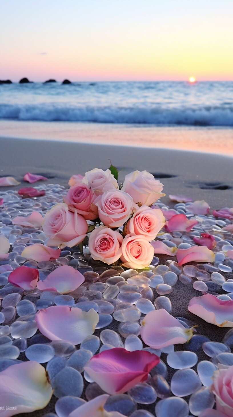 月光下美丽的海滩,海滩上散落着许多彩色的玫瑰和通透的、圆形的、有光泽的鹅卵石。带有玛瑙纹,散发出淡淡的紫色,浅白色玫瑰和鹅卵石散发出蓝色,五颜六色,晶莹剔透,闪闪发光,在沙滩上位成心形,耀眼的灯光,玫瑰洒在蛋白石,花瓣飘落,心形闪亮。高清8kv超广角,超鹅卵石上,非常漂亮,广角镜头,光滑细腻,发光细节七彩祥云