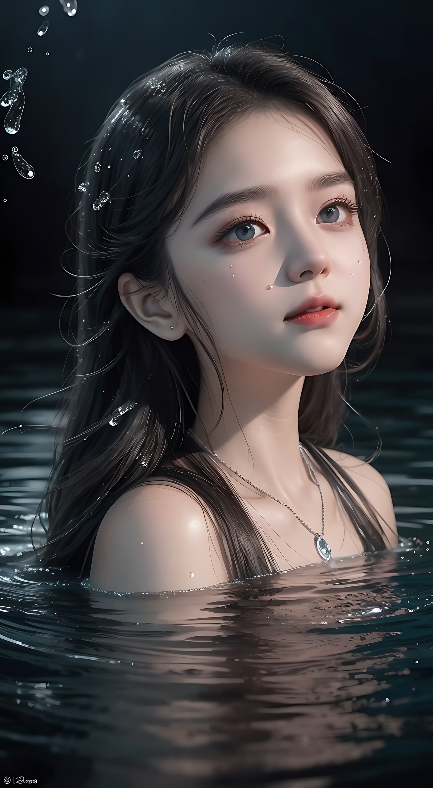 水汪汪大眼,爱心瞳,[害羞],长发,大师作品,最好画质,超高分辨率,更高质量,美少女,女性,心形发饰,8k分辨率,辣妹,学生,美瞳,脸红,细肩带,黄昏,绿洲((瀑布人物在水中)),魔法环,体积光,电影级光照,自然光,雪月法萌少女光肩,solo,黑色晶莹剔透的水花完美辉映,眉心有花纹,美丽的黑色眼睛,漂浮的水花,黑色水珠,美丽的辉光,最佳质量,插图,杰作,最好的制作,最好的质量,高度详细,极其详细的CG,照明,可爱,丁达尔效应,燃烧着水花裹身,光肩,景深,黑色的水,超级萌,闪耀的,绝美的,精致的五官,萌,黑水粒子特效,梦幻,漂浮的黑色发光颗粒,燃烧着的头发,项链