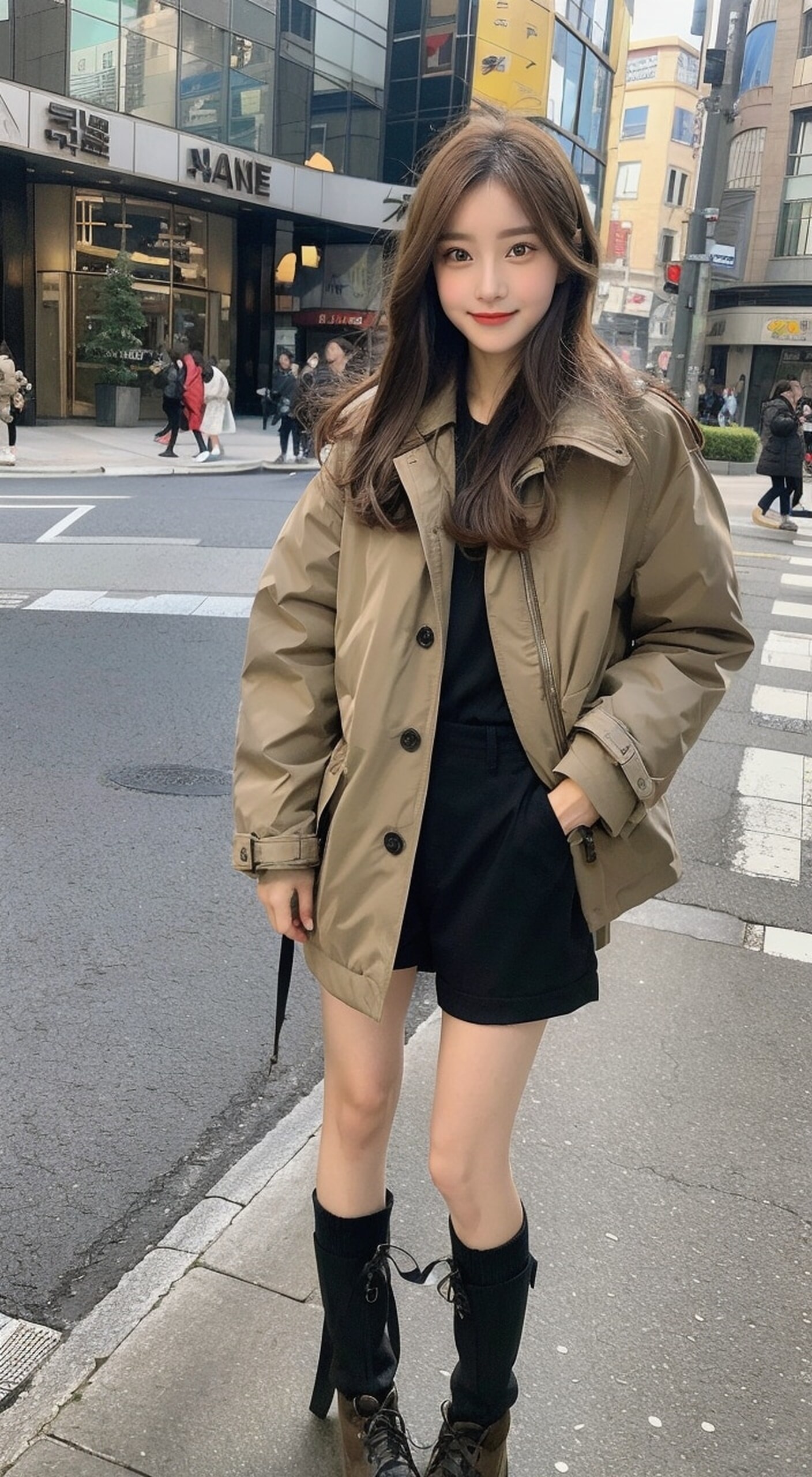 过马路的女孩,棕色短发,大眼睛双眼皮好看的眼睛和眉毛,小嘴巴,五官精致漂亮,面带微笑,上衣棕色夹克外套,里面白色衬衫,下身卡其色短裤,一米二长大粗腿,黑色长筒超薄款ku袜。脚上穿着马丁靴,全身照片,可以看见鞋