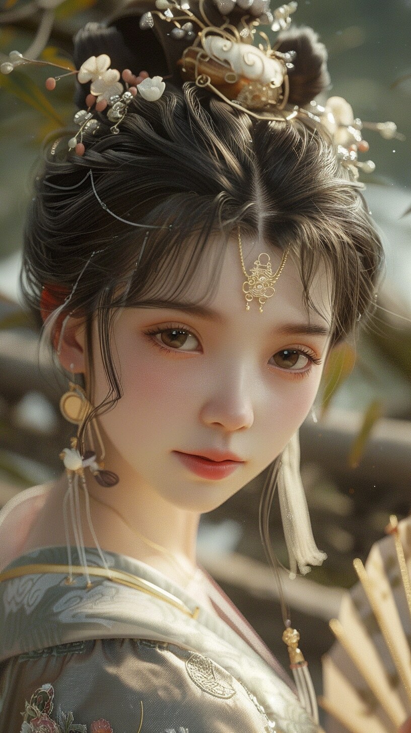 一个妙龄少女,面带笑容,(汉服之美),(苏州园林),艺术巅峰,惊艳人心,(8k高清),细节完美,俯视角度,秀丽容颜,眉目如画,容颜绝世,华丽器饰,端庄婉约,(漂亮双眸),秀发披肩,双环刘海,洋溢笑容,(丝带扣住的柳丁发髻),软绵绵的蓬松发垂,华丽头饰,(精致花边领口),绸缎长袍,透视薄纱,汉族服饰,苏式园景,(双手持扇优雅姿势),视线向远方,曲径通幽,湖光山色,古典氛围,(柔和灯光),纤纤玉指,清雅古典,画卷中的倩影。(点击复制)