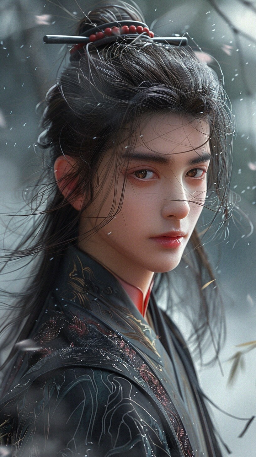 (冰冷的气质感少年)(桀骜不驯的少年)(男的)男,(帅气的古风少年),(干净利落的),(((古风男神长发发型))),(剑眉)(凌乱感),(破碎感),(氛围感), (精致的面容),(高鼻梁),(嘴角上扬),(唇珠),(薄嘴唇),(清澈凌厉的桃花眼),(五官精致),(轮廓分明男生脸型),(冷酷的表情),(弟弟穿着古风的红色汉服),(鎏金黑色半透明宽袍广袖流云袍),(衣服上有流光暗纹),(佩剑)(交领长衫),(完美的手),(完美的身形比例),(全身),(细节刻画入微)(大师之作),(杰作),(最高画质),(细节丰富)(细致手部描写),超高清,8k,HD画质,2.5D,(脸部增强),画面自然柔和,高明度,高饱和度,高对比度,全景人物特写,远景主要提现背景,于朦胧肖像参考,生物透光皮肤质感,桃花林背景,(天空1),飞扬的竹叶的破碎背景效果。(点击复制)