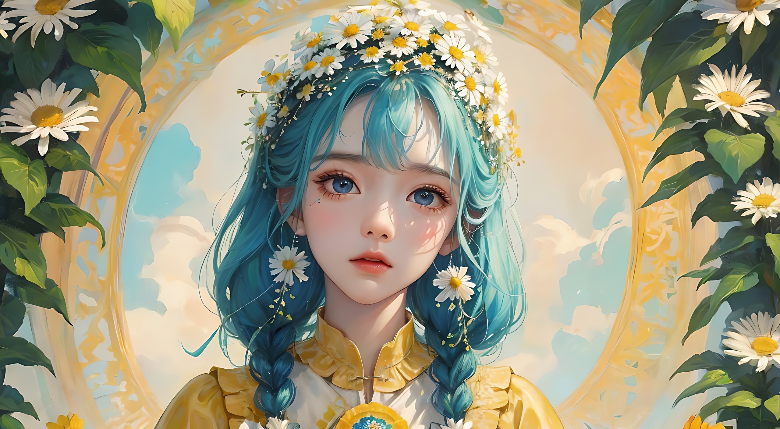 高清,高画质,小雏菊背景围绕,小雏菊花环,桃花衣服,五官精致,水汪汪的大眼睛,黑色的眼珠《双麻花辫》,绿茶头发,光亮肤质,百花仙子,蓝色的大眼睛,水嫩小嘴,面部聚焦,小雏菊花枝,浅黄色宋风汉服,淡黄色,8k