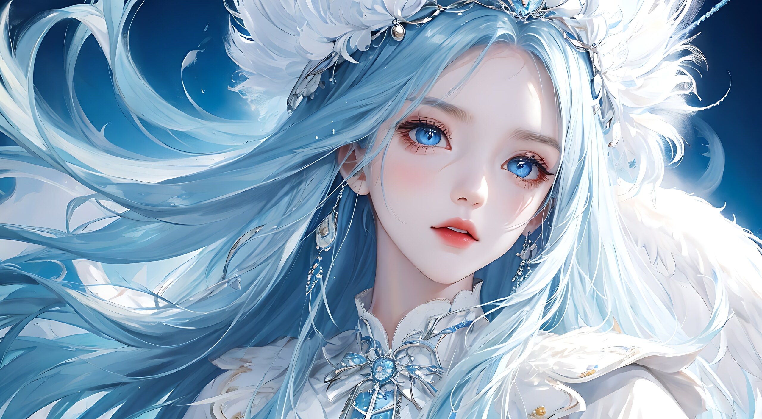 漂亮的女孩,天鹅羽毛饰品,白色渐变长发,青色外套皮夹克,面部特写,精致的深蓝眼睛刻画,深蓝色的眼睛,大眼睛,半身像,蕾丝裙,项圈钻石珍珠,长头发