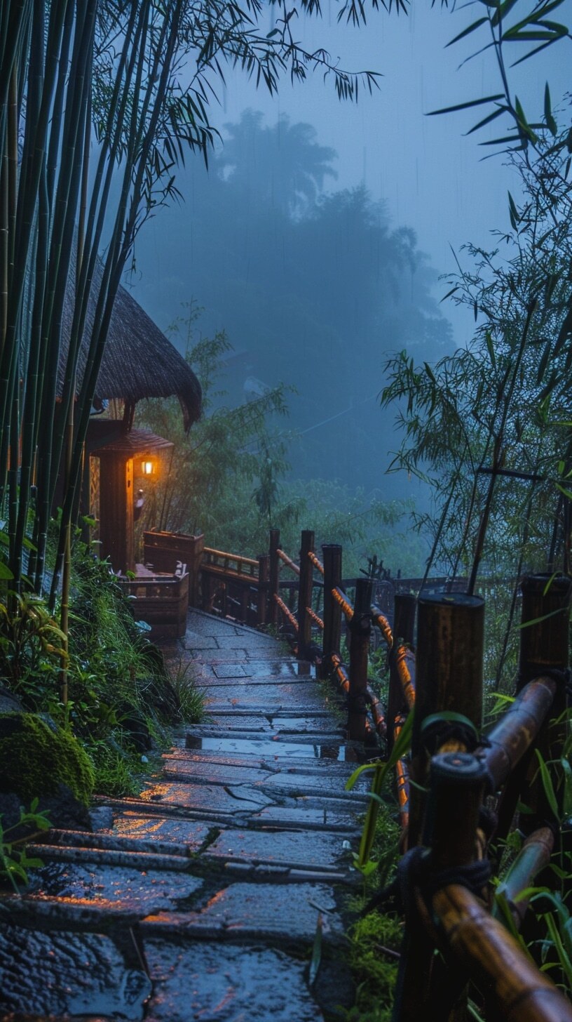 Live shooting, at night, on a rainy day, in the middle of a dense bamboo forest on a hillside, there is a wet and secluded stone path with wooden railings. In the distance, it is foggy. The thatched cottage on the left, the wooden tail on the hillside opens a door, and the lights are on. The nearby bamboo is thick and green, and the bamboo in the bamboo forest is next to one another, showing all the bamboo leaves. Wide-angle shooting, the picture is ultra-high-definition, ultra-real v2.5(点击复制)