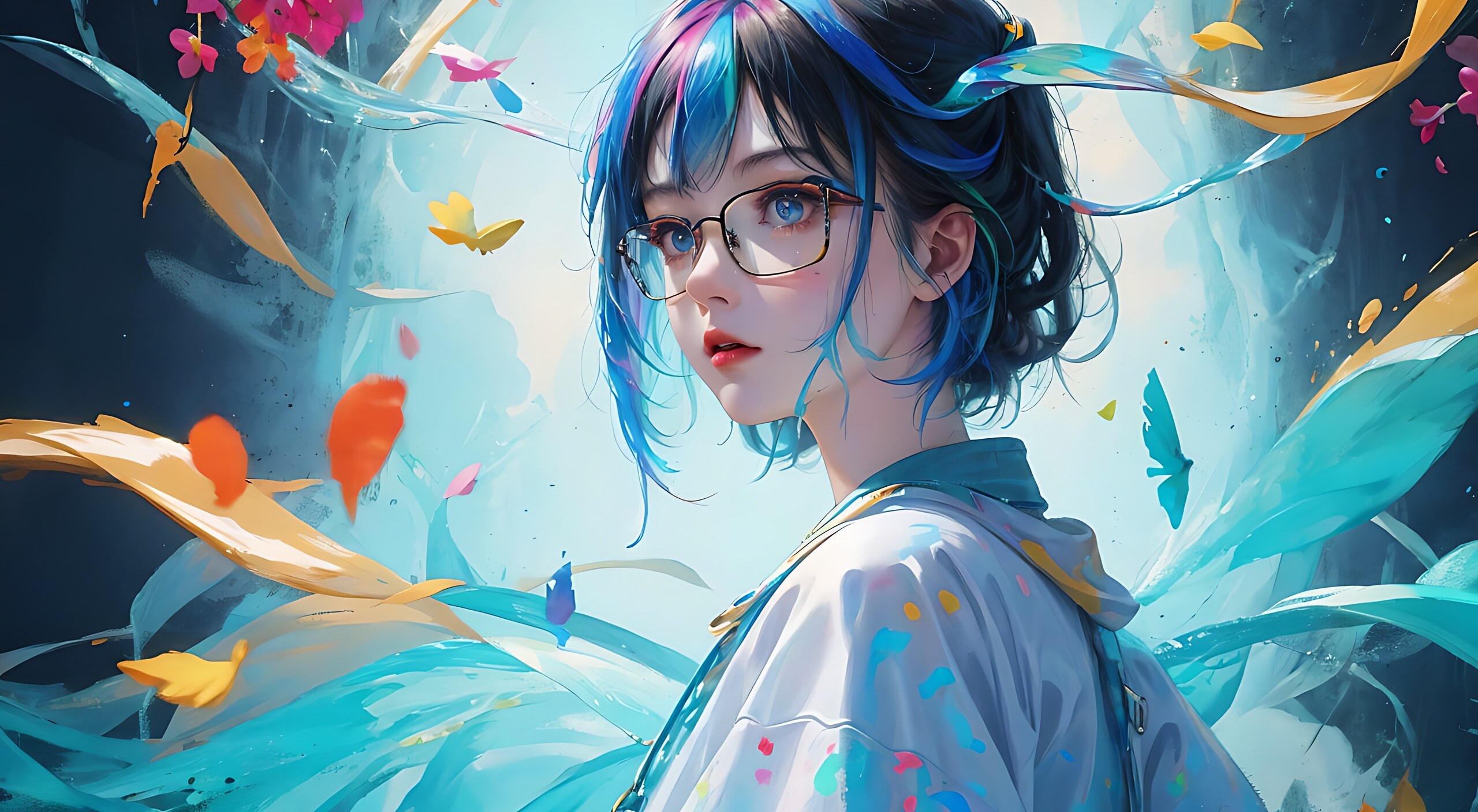 可爱女孩,正脸,浅蓝衬衫,背景油漆爆炸,丙烯颜料,颜色飞溅,泼墨,色彩飞溅,彩虹亮光的短发,彩虹颜色头发,半身,头戴五颜六色的小花儿,深蓝色瞳孔,戴眼镜,彩虹亮光的斜刘海,画面精致,脸部精致,3D效果,高清,油漆飞溅,色彩飞溅,完美cg,8k