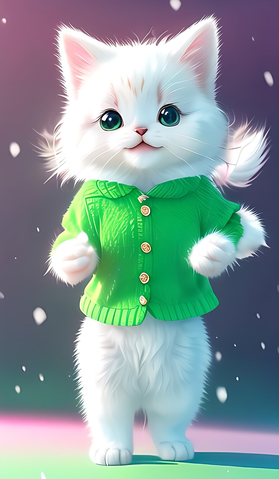 一只两腿站立的雪白色小猫咪,可爱的耳朵,穿着绿色的衣服,穿着粉色的鞋子,笑容可爱。