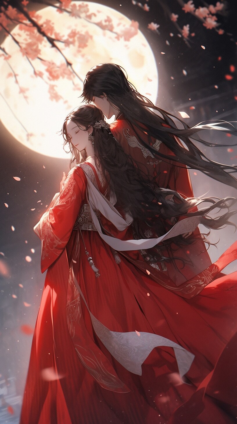 "一对穿着红色古装的男女,红唇,精致头饰的美丽女孩,男人红衣墨发披肩,束冠,水晶般清澈的钻石纹理,月光下,红枫树林,枫叶纷飞,红色月光,金色,动态模糊,电影般的镜头,腰部拍摄,中国风格,传统中国水墨画,晨昏射线,全局照明,发光的放射性,全景视野,侧视图,景深(点击复制)"