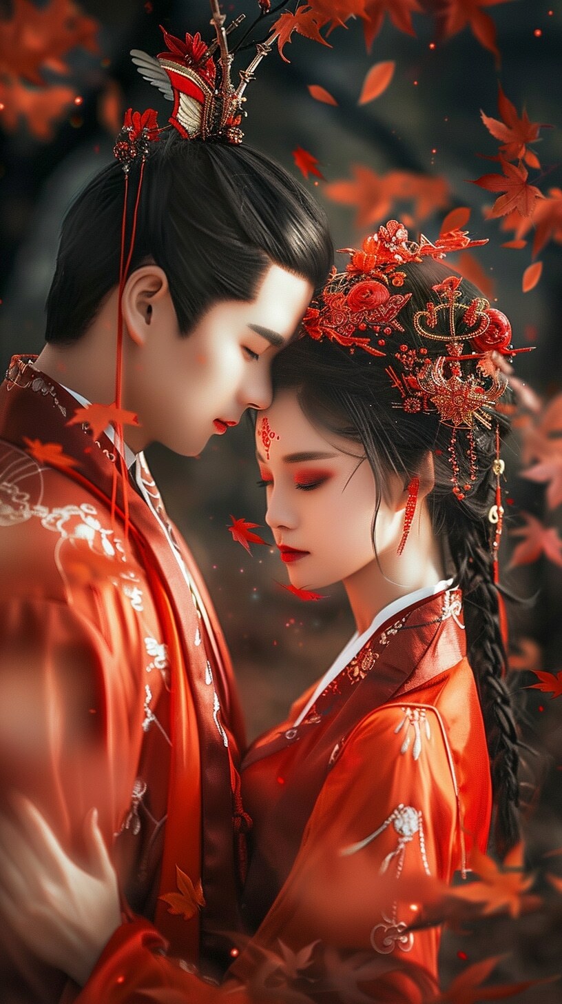"一对穿着红色古装的男女,红唇,精致头饰的美丽女孩,男人红衣墨发披肩,束冠,水晶般清澈的钻石纹理,月光下,红枫树林,枫叶纷飞,红色月光,金色,动态模糊,电影般的镜头,腰部拍摄,中国风格,传统中国水墨画,晨昏射线,全局照明,发光的放射性,全景视野,侧视图,景深(点击复制)"