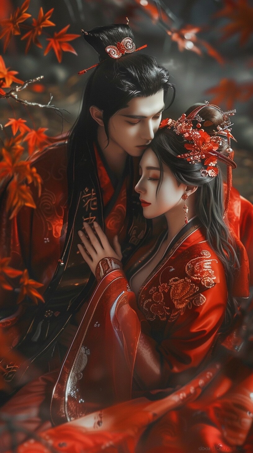 "一对穿着红色古装的男女,红唇,精致头饰的美丽女孩,男人红衣墨发披肩,束冠,水晶般清澈的钻石纹理,月光下,红枫树林,枫叶纷飞,红色月光,金色,动态模糊,电影般的镜头,腰部拍摄,中国风格,传统中国水墨画,晨昏射线,全局照明,发光的放射性,全景视野,侧视图,景深(点击复制)"