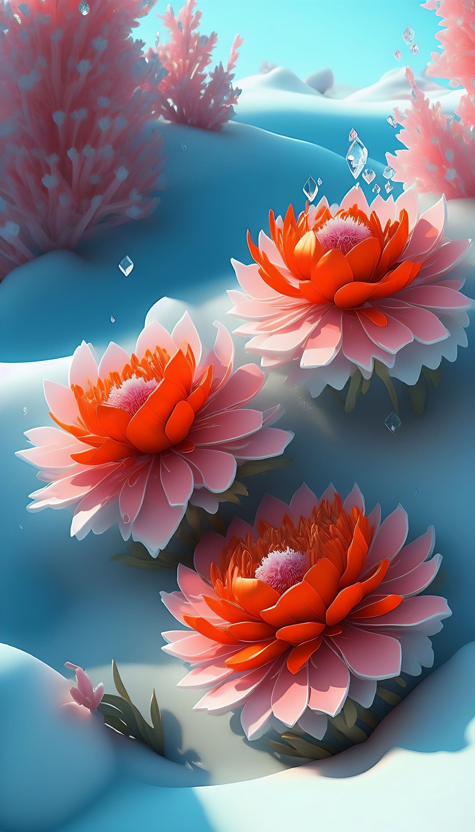 flowers in snow 3d ice art flowers 3d wallpapers 3d, in the style of time-lapse photography, light red and aquamarine, hyperrealistic illustrations, unreal engine 5, realistic yet romantic, pink and orange, surrealism-inspired --ar 59:128(点击复制)