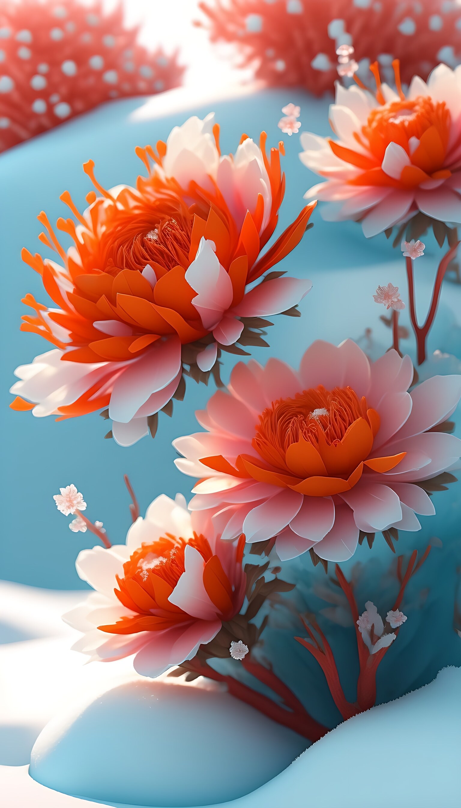 flowers in snow 3d ice art flowers 3d wallpapers 3d, in the style of time-lapse photography, light red and aquamarine, hyperrealistic illustrations, unreal engine 5, realistic yet romantic, pink and orange, surrealism-inspired --ar 59:128(点击复制)