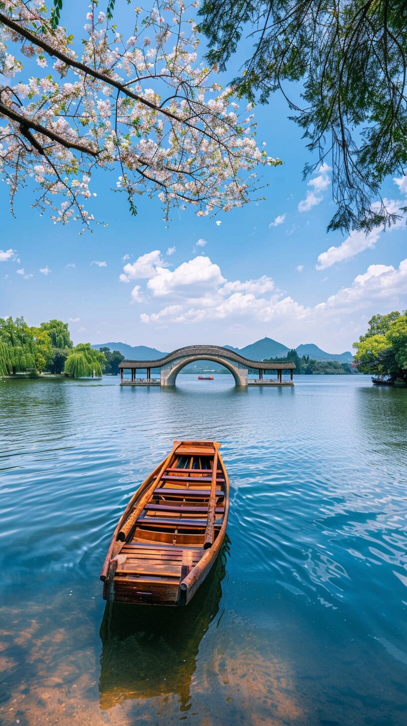 杭州西湖,夏日风景秀丽,湖面清澈,碧水蓝天,有亭台楼阁,湖心有石拱桥,湖中有木船,有树木花开,碧空万里,全景真实自然,超细,8k高清。