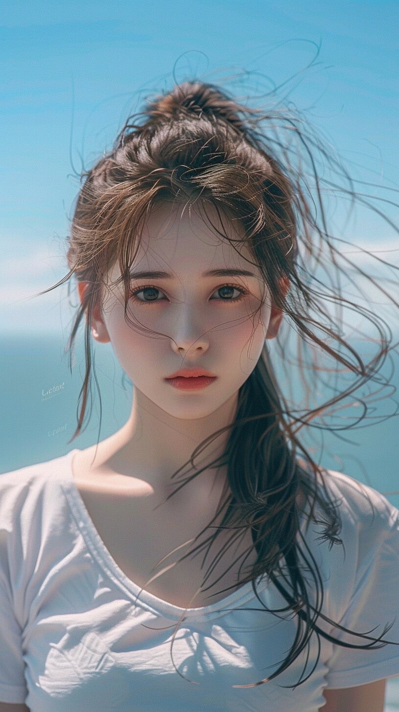 气质微笑女孩,精致五官,色马尾头,头发凌乱,头发极具真实感,穿着短袖的白色衬衫,背景是天空,海景,杜琼,精致的妆容,淡红唇,大眼睛,双眼皮,黑色的曈孔,眼神明亮,面部对称,人脸非常的真实,细致的刻画女孩的面部,腮红,超高的颜值,望向观众,极具真实感的皮肤,皮肤油光反光,艺术作品,衣服具有真实的布料质感,写实绘画,电影风格,摄影级别,光线追踪,真实的光影效果,真实感,大师之作,如同最顶级摄影效果,8K(点击复制)