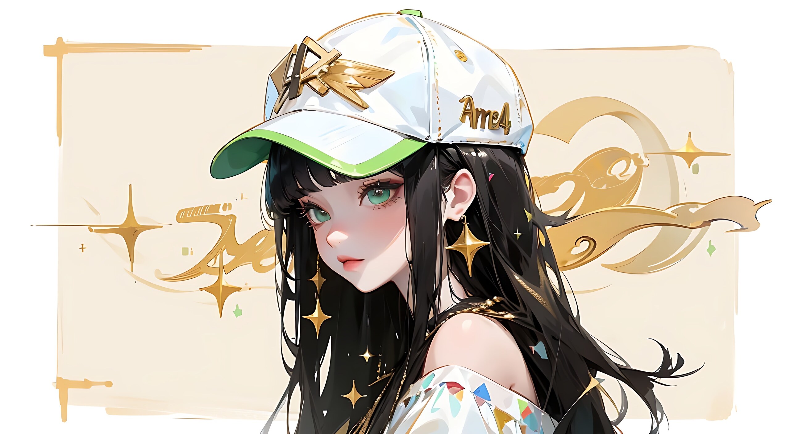 美式甜心风格,酷酷的女孩,黑色长发,有刘海,戴着棒球帽,五官立体,眼妆精致,眼睛周围有亮片装饰,侧脸,绿色露肩衣服,金色配饰,上半身,纯白背景
