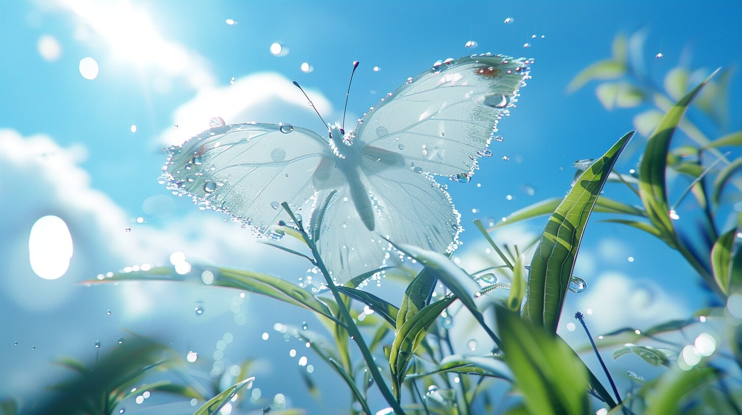 白蝴蝶, blue_sky, 白色的蝴蝶, butterfly, scenery, sky, 露水, wings,露珠,水滴,叶子,植物,艺术感,梦幻