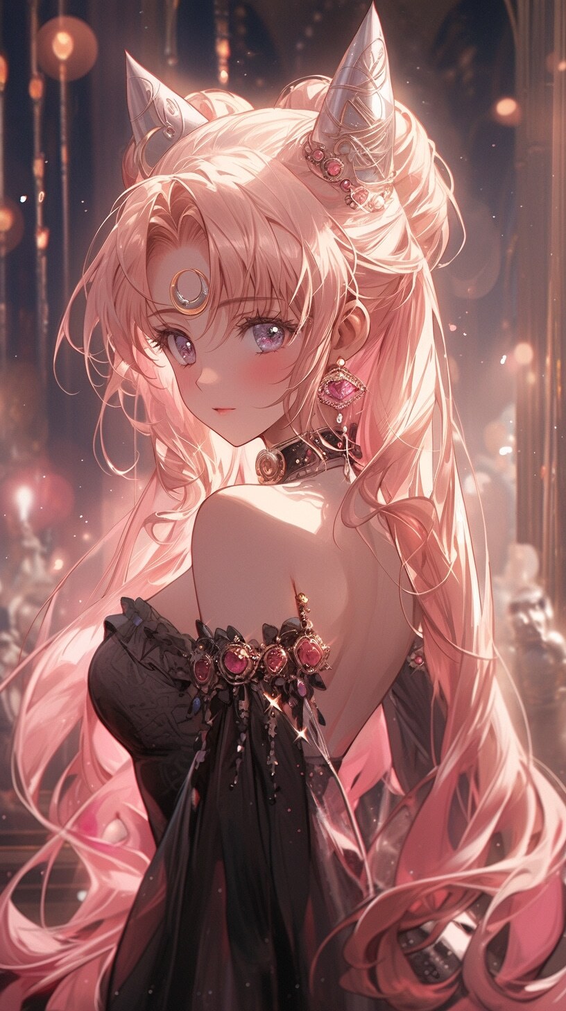 Sailor moon in the sky, with a silver body and glitters with lights above,extreme iridescent reflection, in the style of vray tracing, vibrantmanga, shiny/ glossy, rococo pastel, fluid form, tinycore, fluid impressions, vray, machine aesthetics, yanjun cheng, silver, shiny eyes, fluidform.