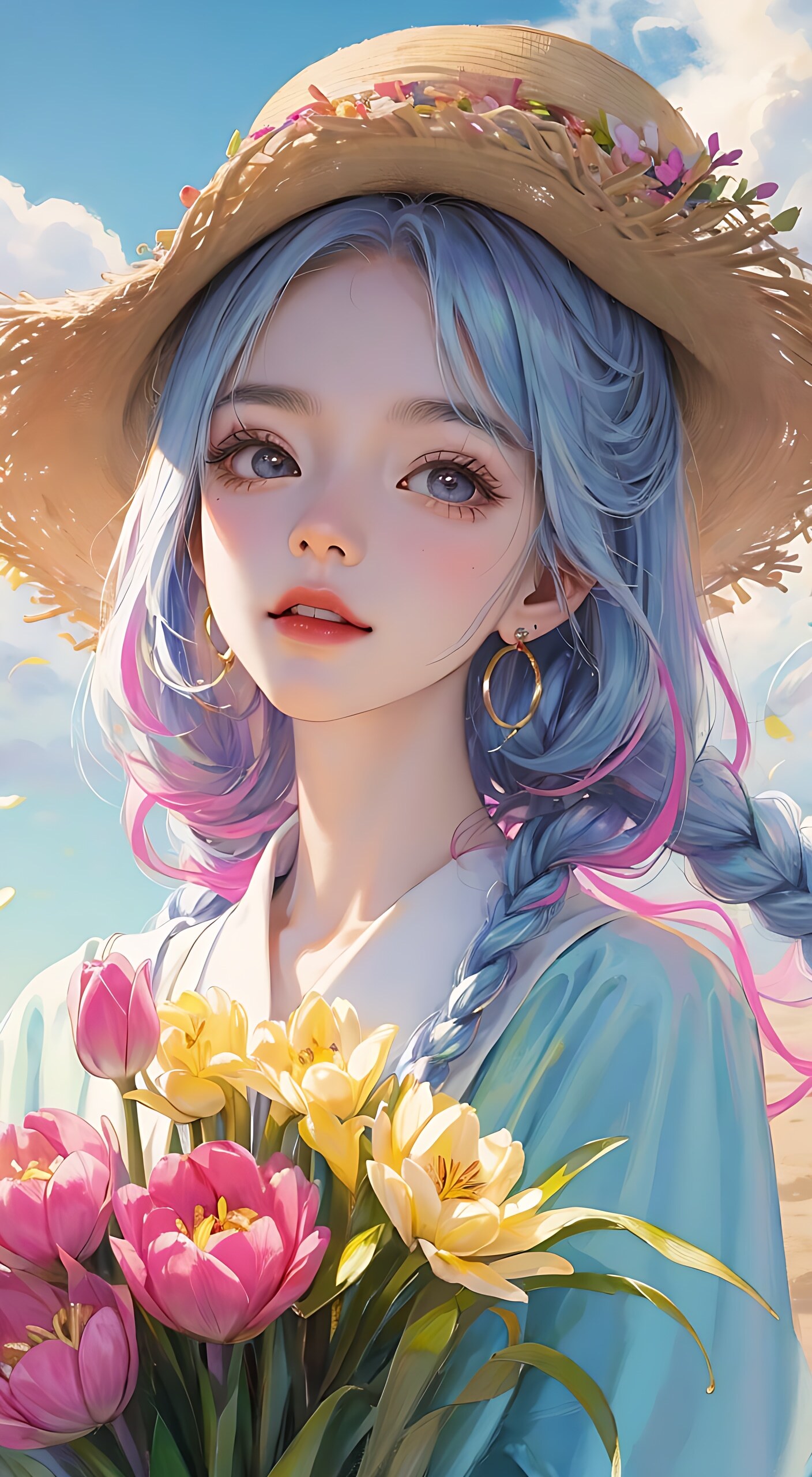 宫崎骏,清凉夏日,萝莉女孩,大大的眼睛,戴着草帽,郁金香花田,田埂,可爱的少女,彩虹色亮光长发麻花辫子,头带草帽,穿着半露肩浅色连衣裙,彩色清澈眼眸,面带笑容,开心,小脸、大耳环、高鼻梁,去重,手捧粉色郁金香(手抱着郁金香),脸贴近粉色郁金香,半身肖像,高质量CG,8K分辨率,超清晰,干净的背景