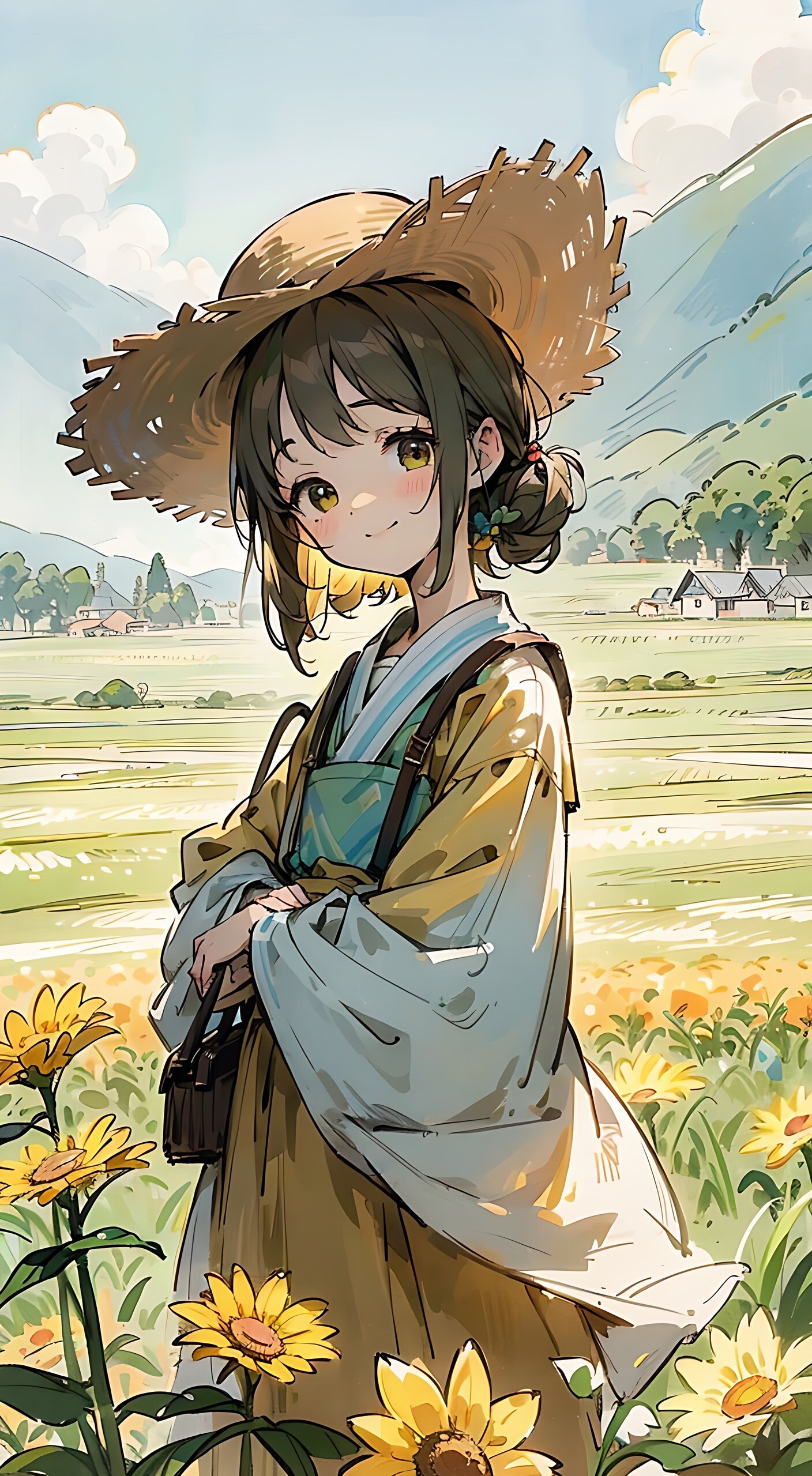 治愈系,一幅温馨快乐的画面,阳光温和,高细节,场景为美丽的草原,远处的高山,小女孩童年,幼稚可爱,精致的五官,女孩带着草帽,穿黄色衣服,在农家院子里,盛开着鲜艳的鲜花,女孩笑眯眯的眼睛,阳光照在女孩的脸上,展示了农村的宁静,梦幻,宫崎骏,8倍分辨率,景深