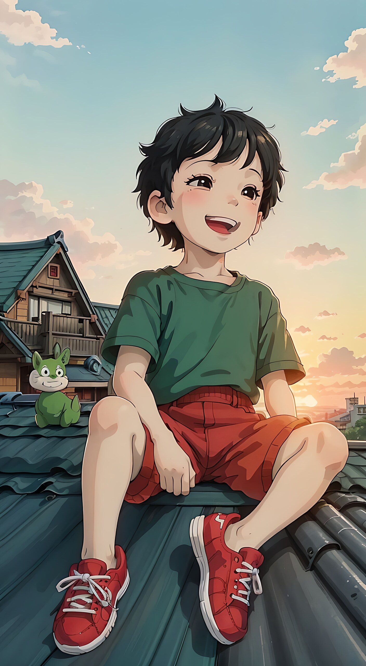 一个开心的小男孩,坐在房顶上,全身照,哈哈大笑,穿绿色的短运动衣,红色运动鞋,黑色头发,有房子,有花草,宫崎骏风格,其他小动物一个开心的小男孩,圆圆的脸大眼睛长睫毛,日落夕阳