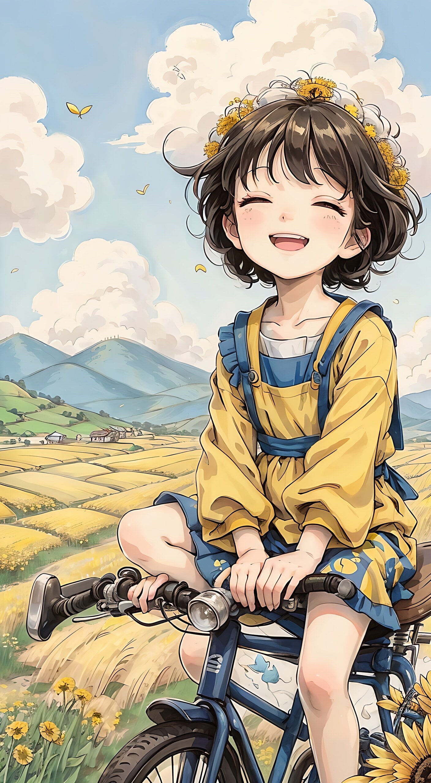 一个开心的小女孩和一个男孩,坐在屋顶上,哈哈大笑,黄色短袖,黑色头发,高山,麦田,油菜花海,宫崎骏风格,鲜花,蓝天白云,其他小动物一个开心的小男孩,瓜子脸大眼睛长睫毛,踩着单车,哈哈大笑,有风吹来