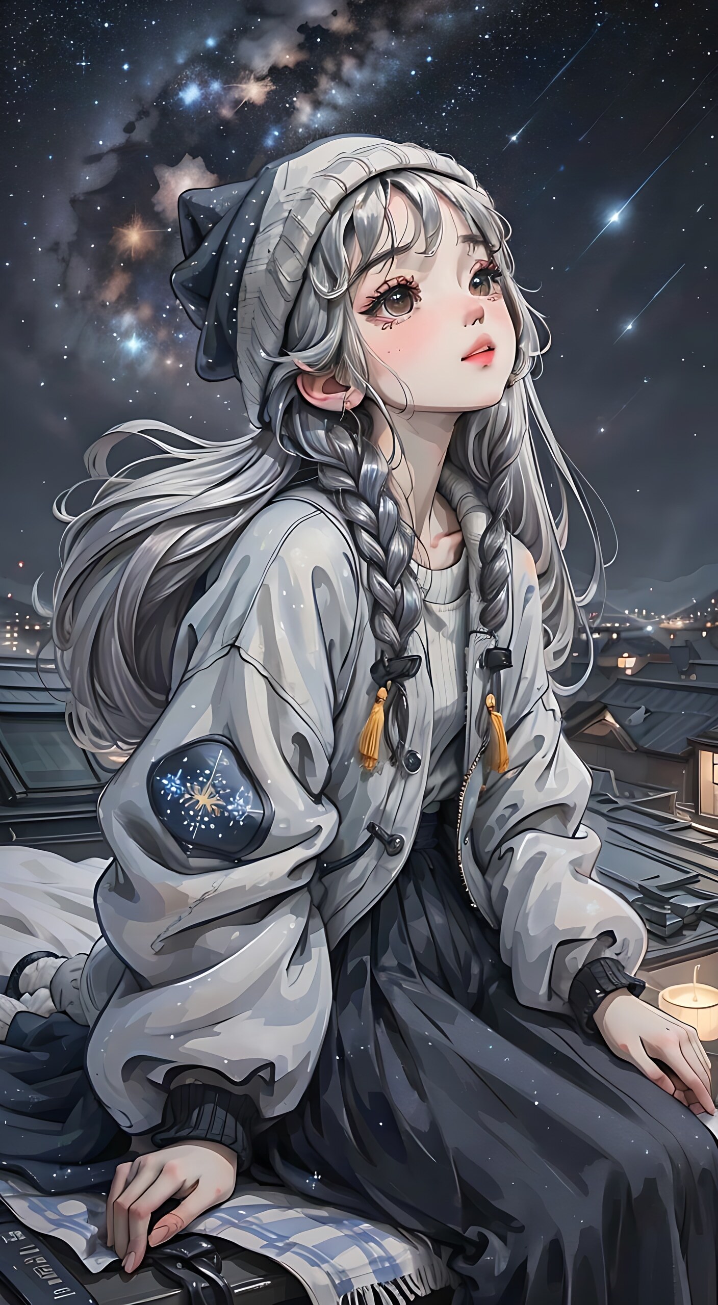 一个小女孩, 仰望星空, 眼神清澈, 单人, 全身照, 面向观者, 第一人称视角, 坐在屋顶, 旁边有宠物,心情愉悦, 唇角微微上扬, 夜空璀璨星光, 漆黑背景, , 长发梳理整齐, 细节精致, 长睫毛, 脸蛋透亮, 皮肤细嫩,,(银色夜空)。带着针织帽子,针织外套
