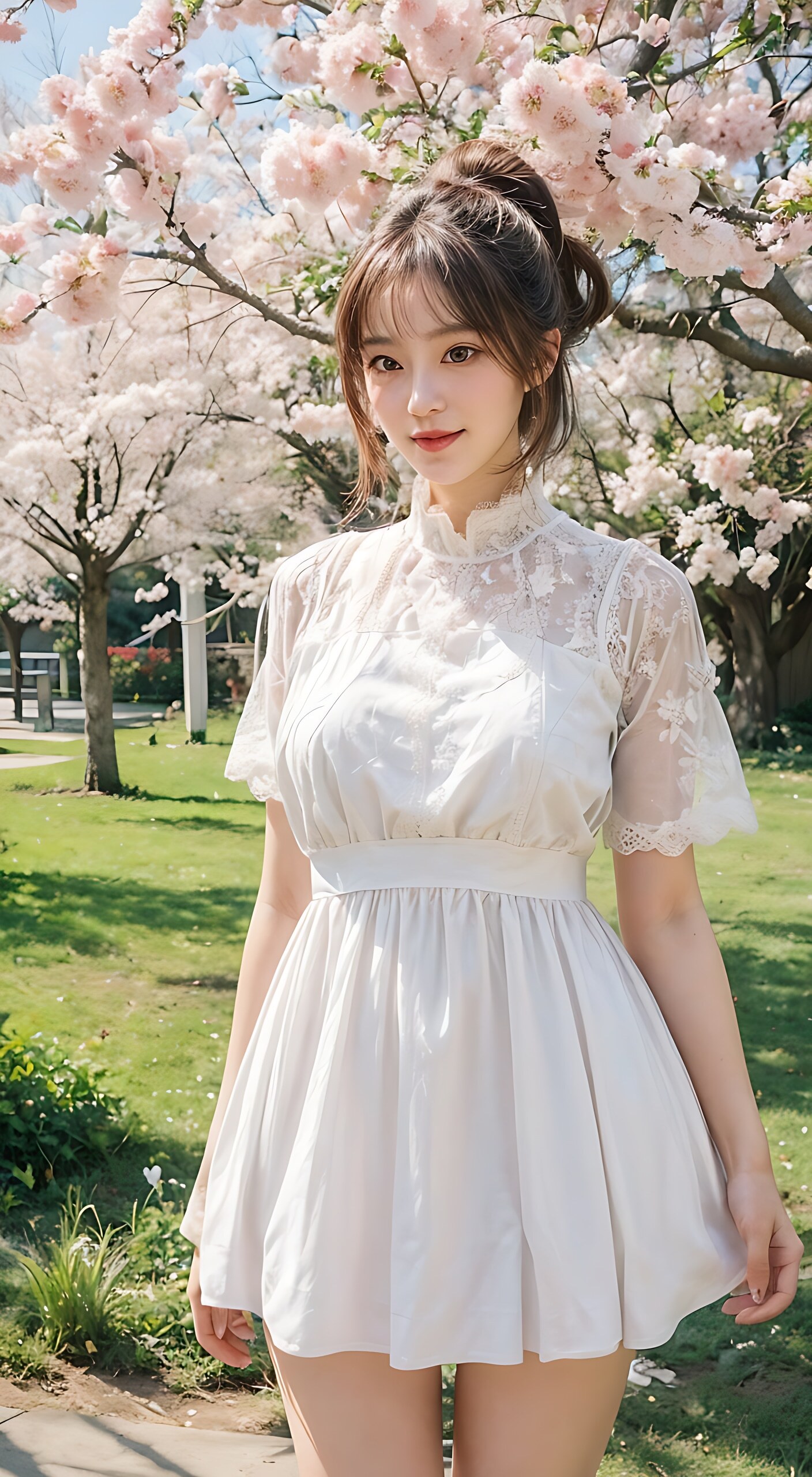 一个女孩,穿着白色连衣裙,镂空花边,站在在(桃花树下),高清细节,精至的五官,大眼睛双眼皮,超级美丽((皮肤白皙)),精致的面孔,完美无瑕,涂着粉色口红,面带微笑,扎着马尾辫,高光细节 ,完美的身材比例(面相镜头),露腿3:2 高清8k