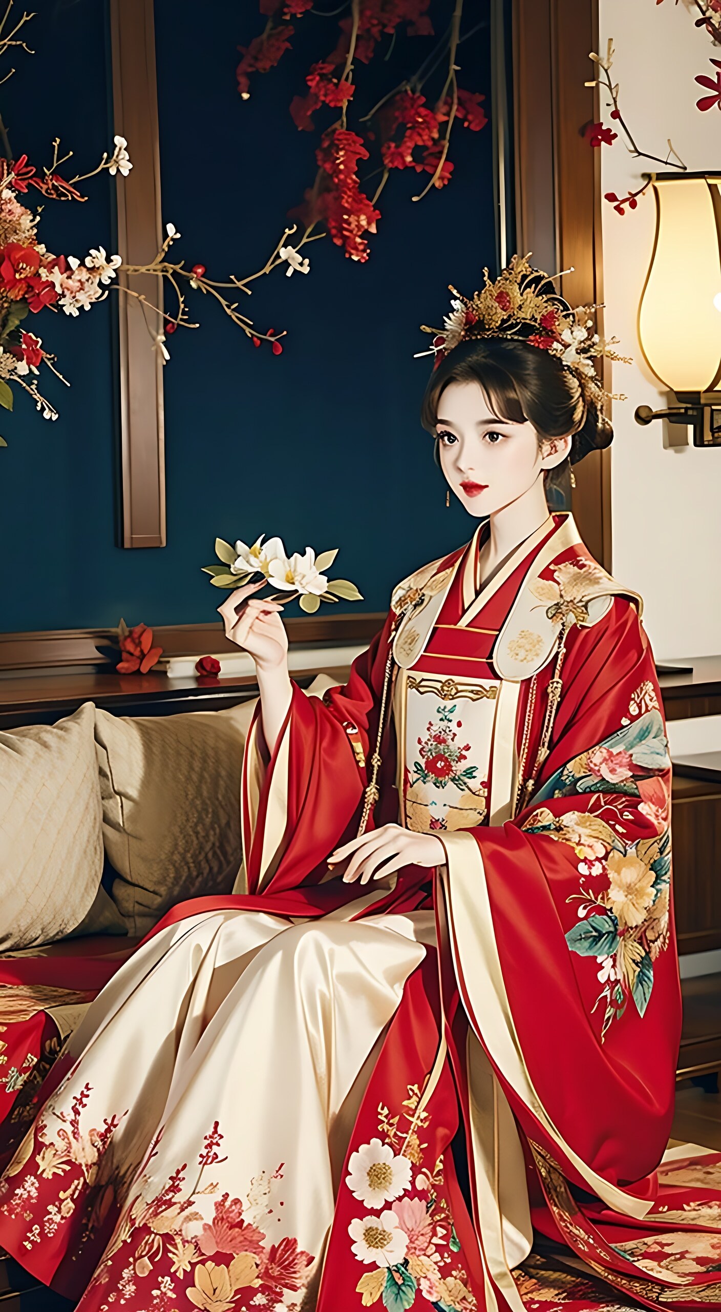 一个忧郁的小女孩,戴着大红色蝴蝶结,五官精致,脸部增强,坐在两边都是花的楼梯口,茶色头发,一脸茫然眺望远方。淡蓝色小裙子,头发编的非常好看,瓜子脸大眼睛长睫毛,花草,蔷薇花,落日夕阳,