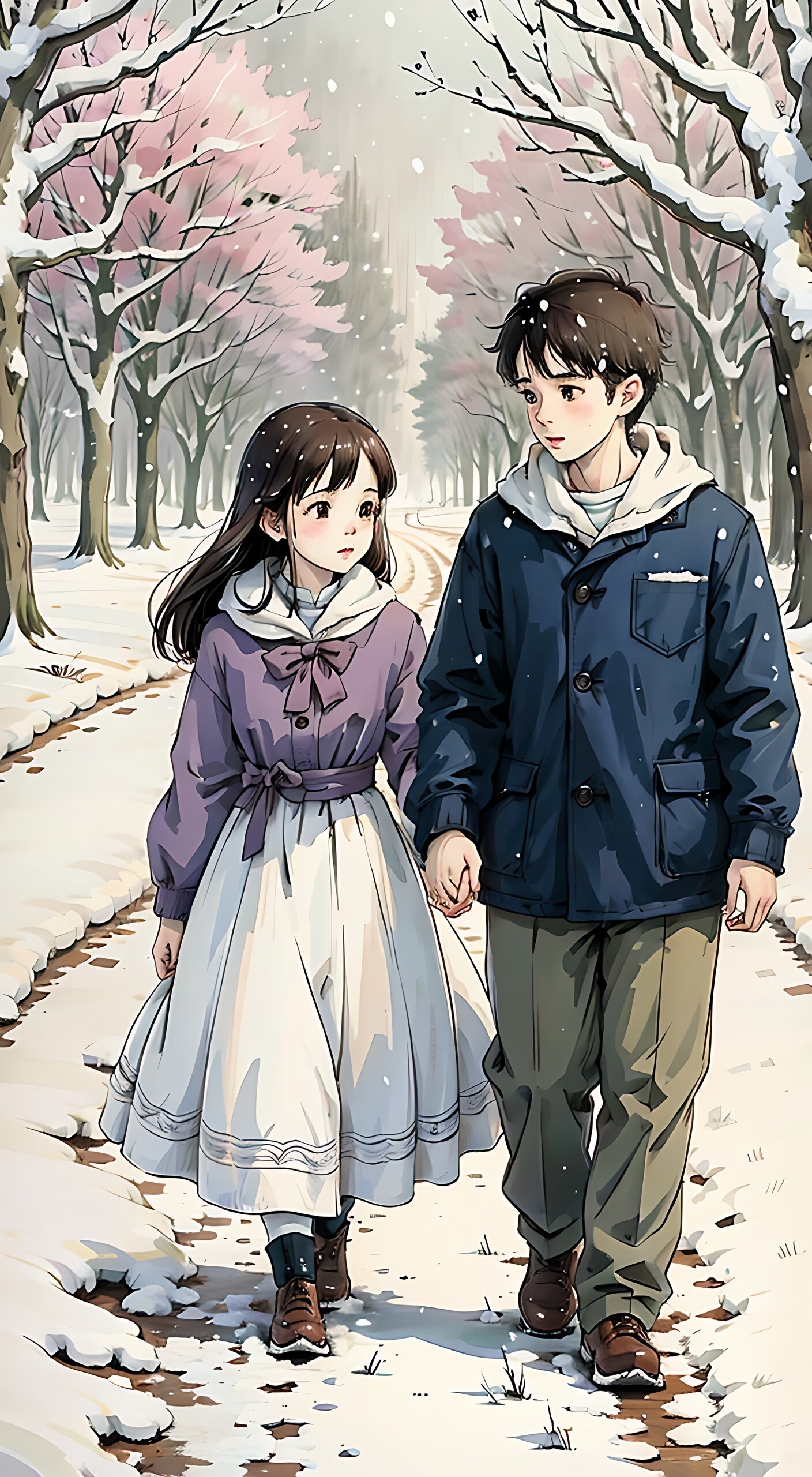小情侣 手牵手在雪地里漫步 浪漫 旁边有树,树叶上有雪,男孩休闲朋克服,女孩裙装套装甜美