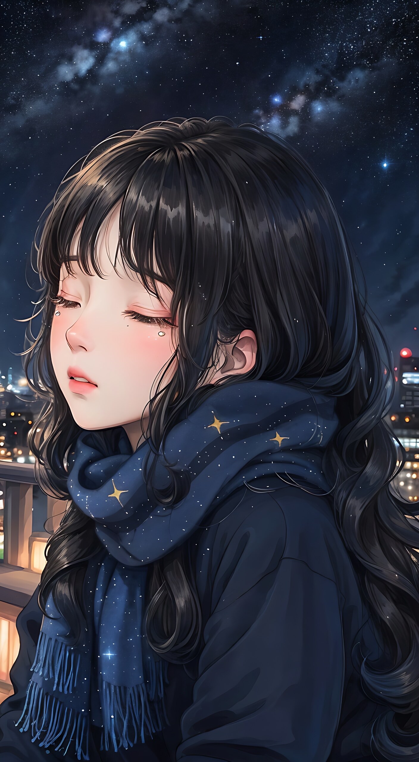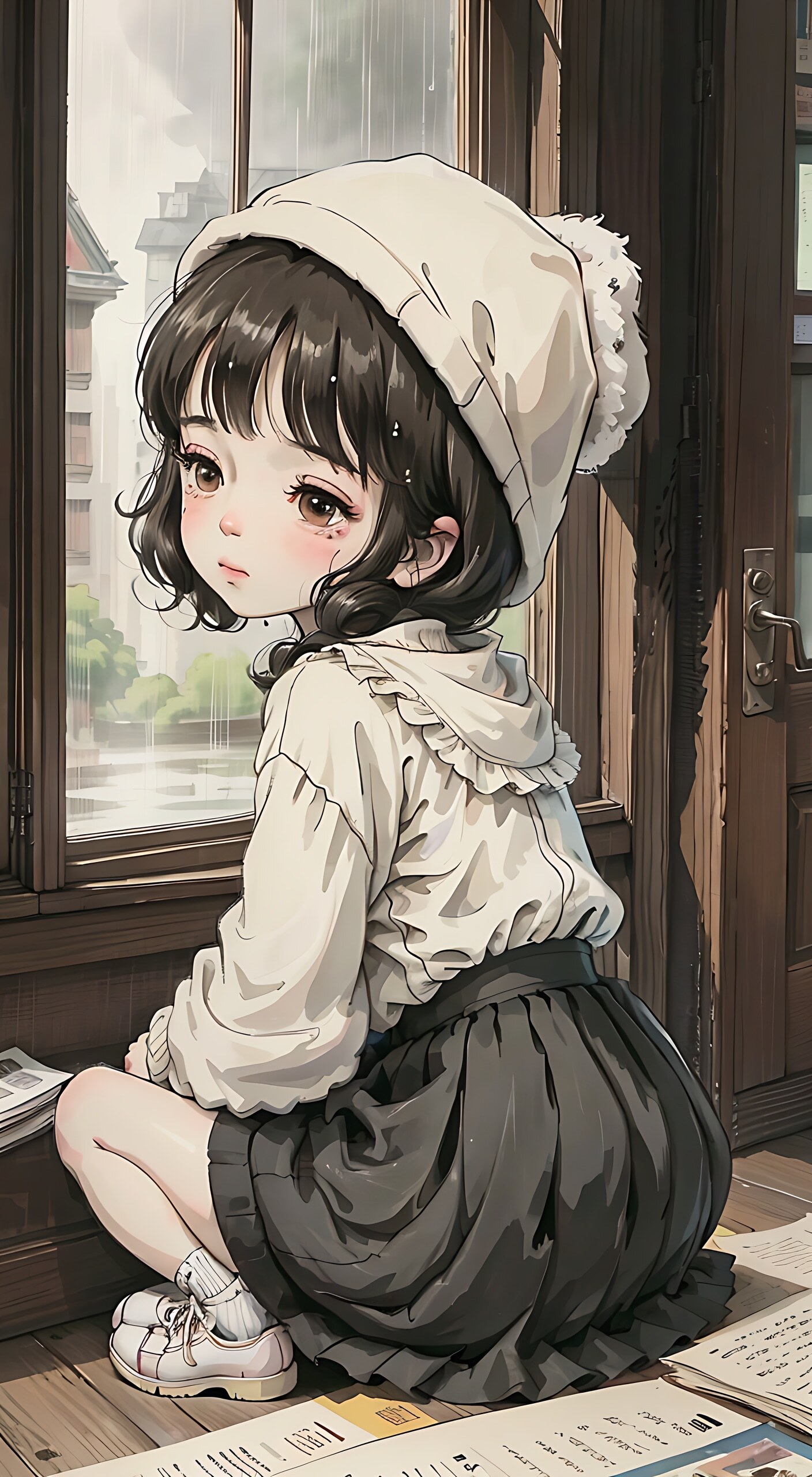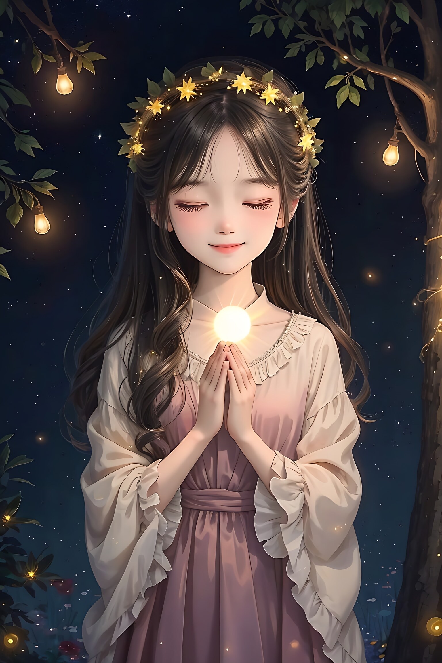 masterpiece, best quality,highly detailed,,tanuki hood,girl,loli,hood up,brown hood,long sleeve,happy,short hair,no animals,solo,stars,large pocket,capelet,smile,night,sea,light brown cloak,white Chinese knot,fake animal ears,cape with star,hood with star,