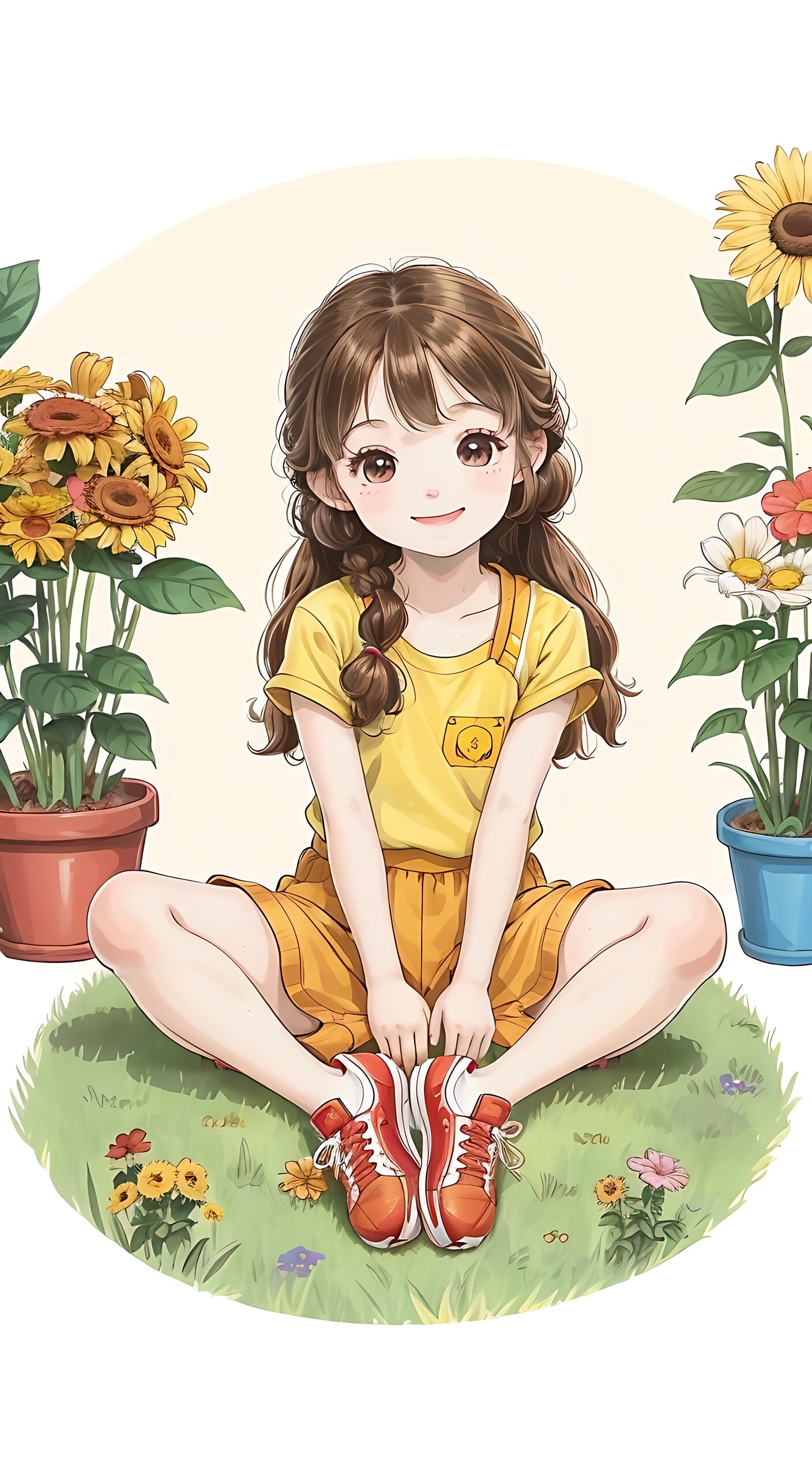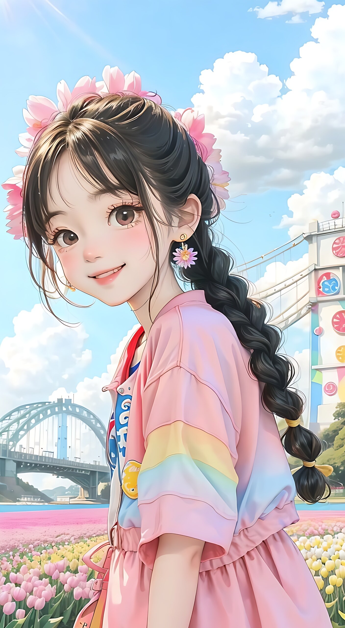 可爱的少女,彩虹色亮光长发麻花辫子,头带布满向日葵花的帽子,穿着五颜六色上衣,彩色清澈眼眸,面带笑容,小小脸