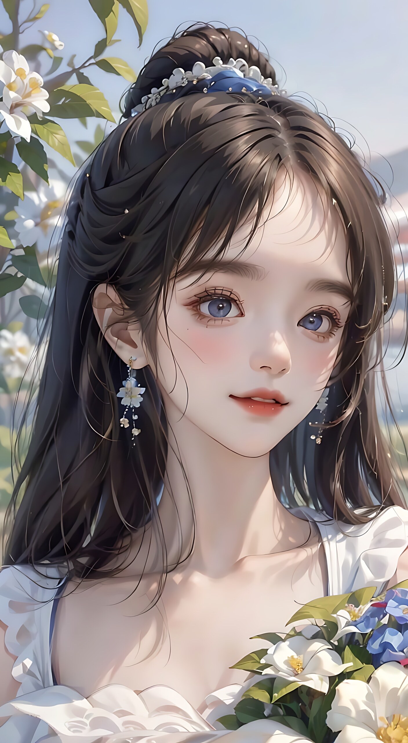 一个女孩,五官精致,瓜子脸,刘海,化妆,大眼睛,不露牙齿微笑,蓝色卷发(时尚),戴着大草帽,白色花耳环,锁骨,黄色短袖,白色背景,蓝色天空