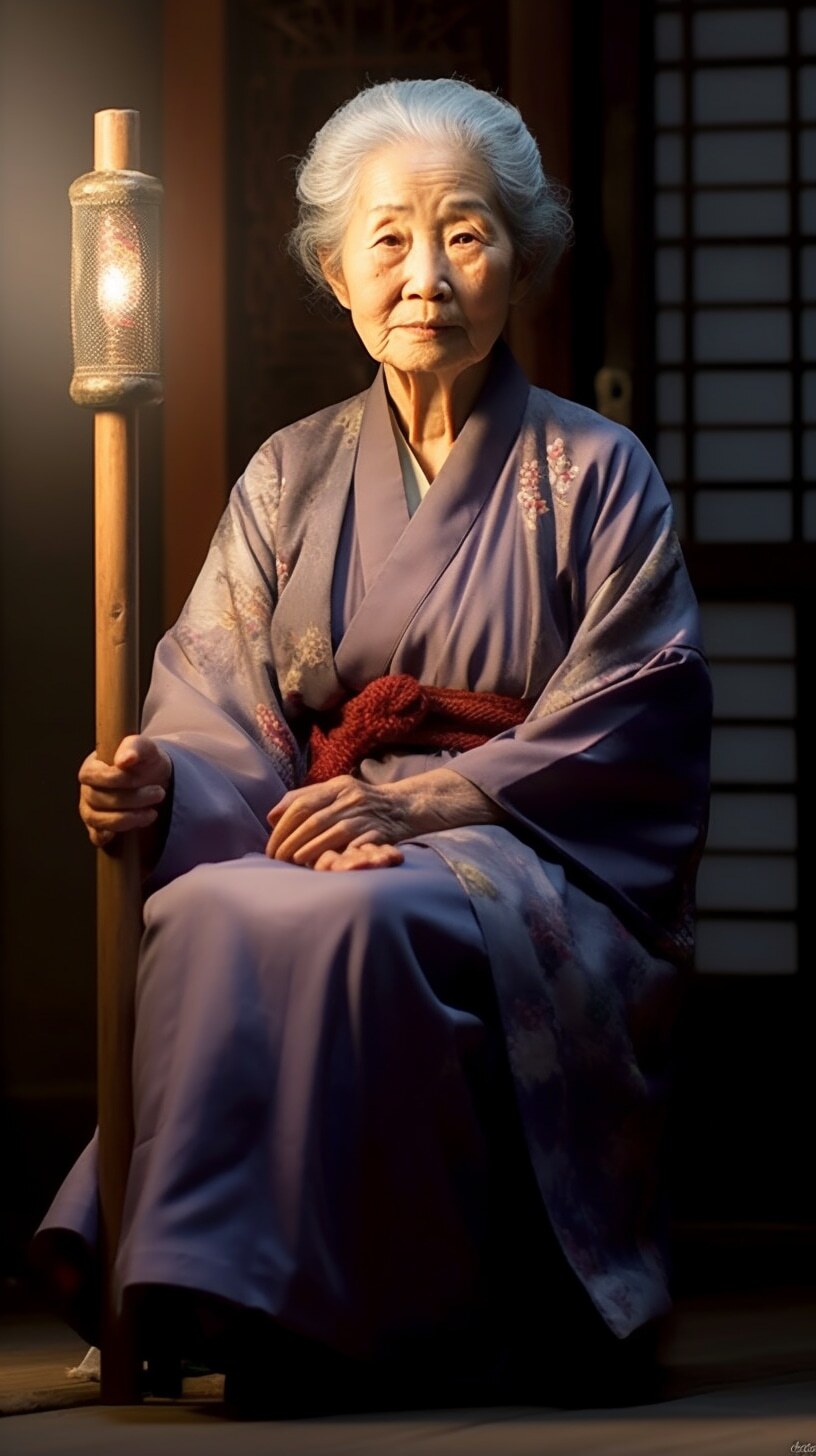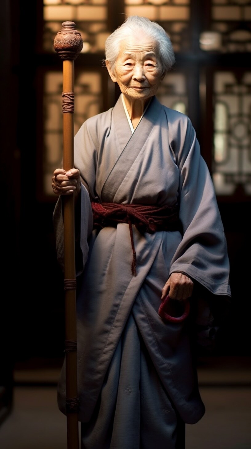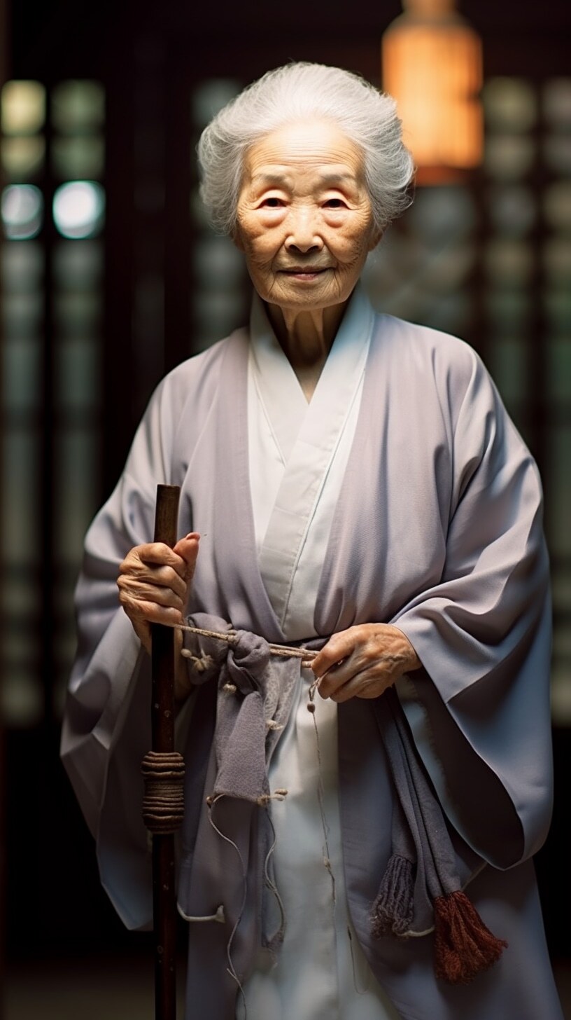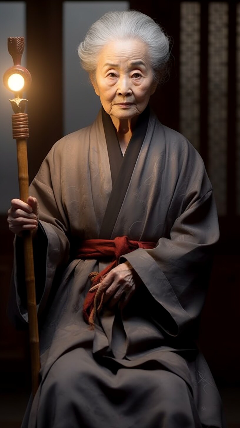 一个漂亮老婆婆,盘发头,满头白发,身穿麻布旧衣裳,中国风范,高高的鼻梁,拄着龙头拐杖,盘坐门前,正面全身照,正视前方,高清,白天,亮堂堂,背景屋前,超高清
