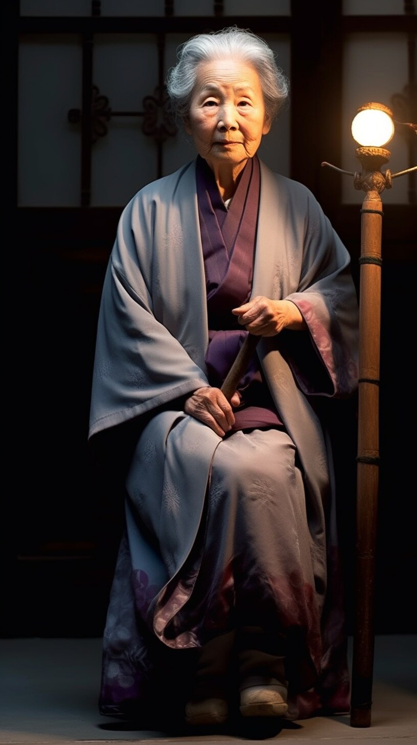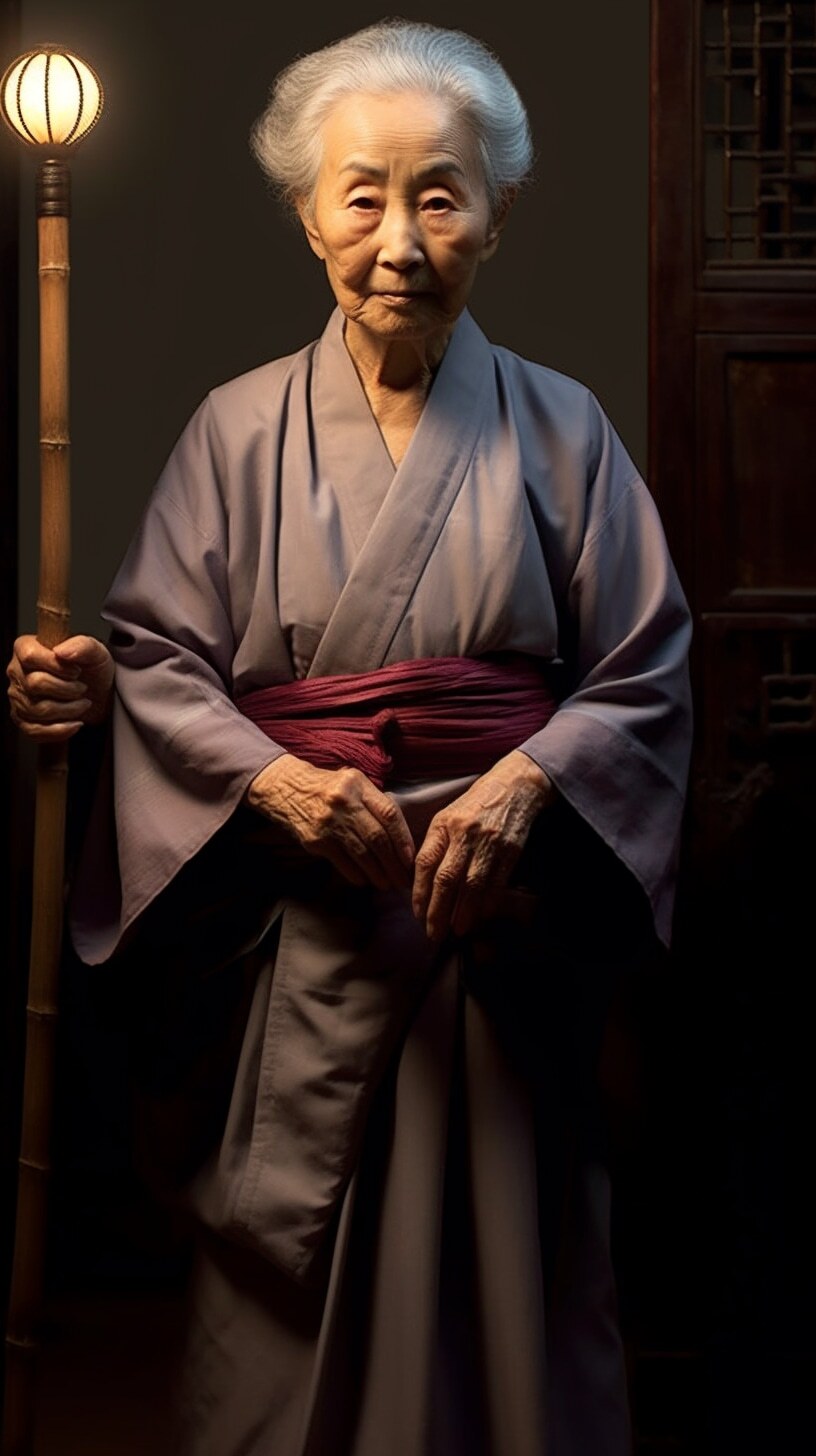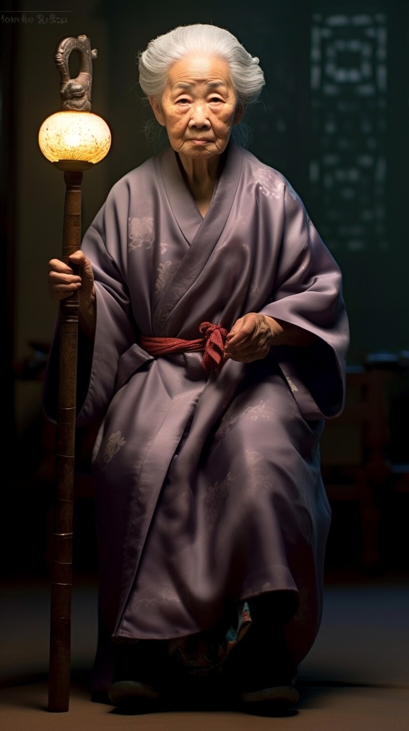 一个漂亮老婆婆,盘发头,满头白发,身穿麻布旧衣裳,中国风范,高高的鼻梁,拄着龙头拐杖,盘坐门前,正面全身照,正视前方,高清,白天,亮堂堂,背景屋前,超高清