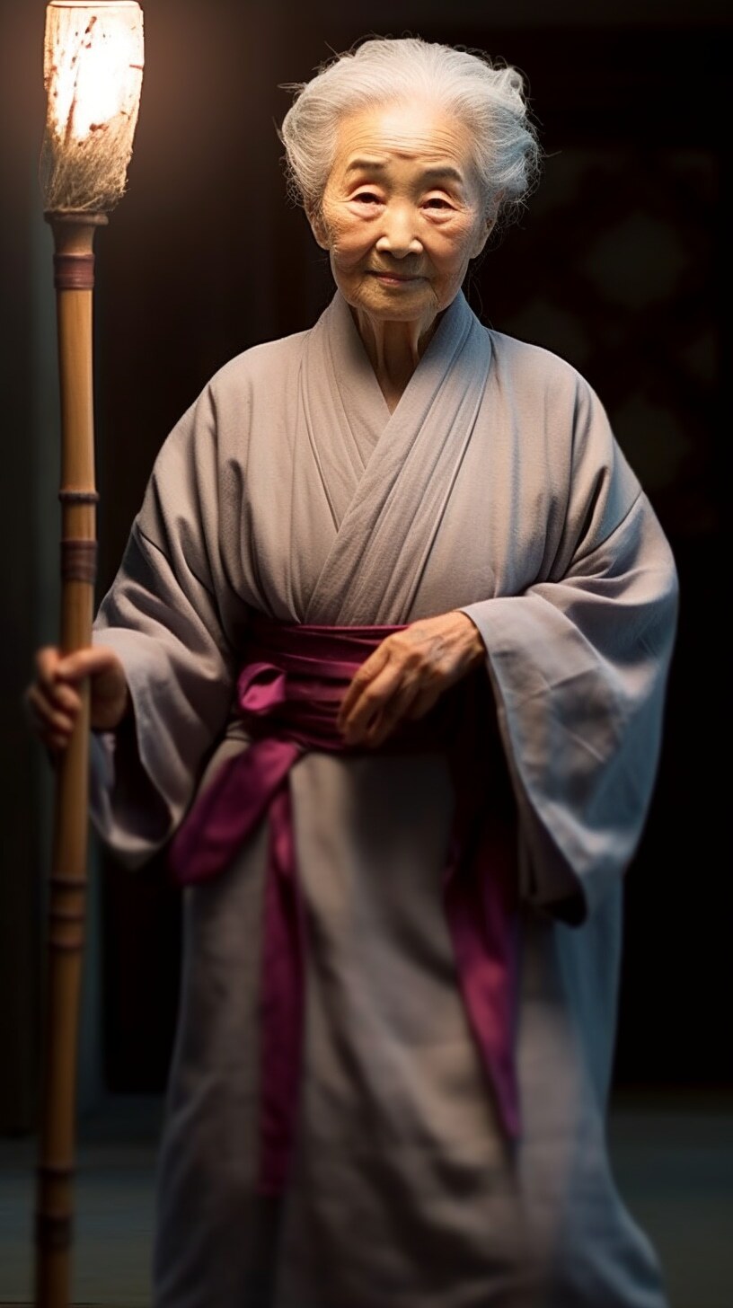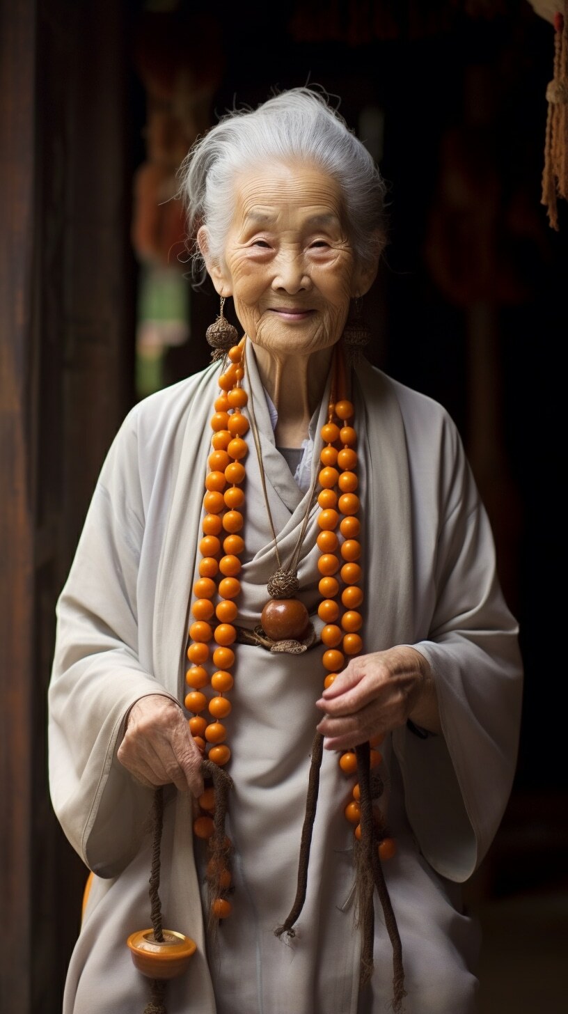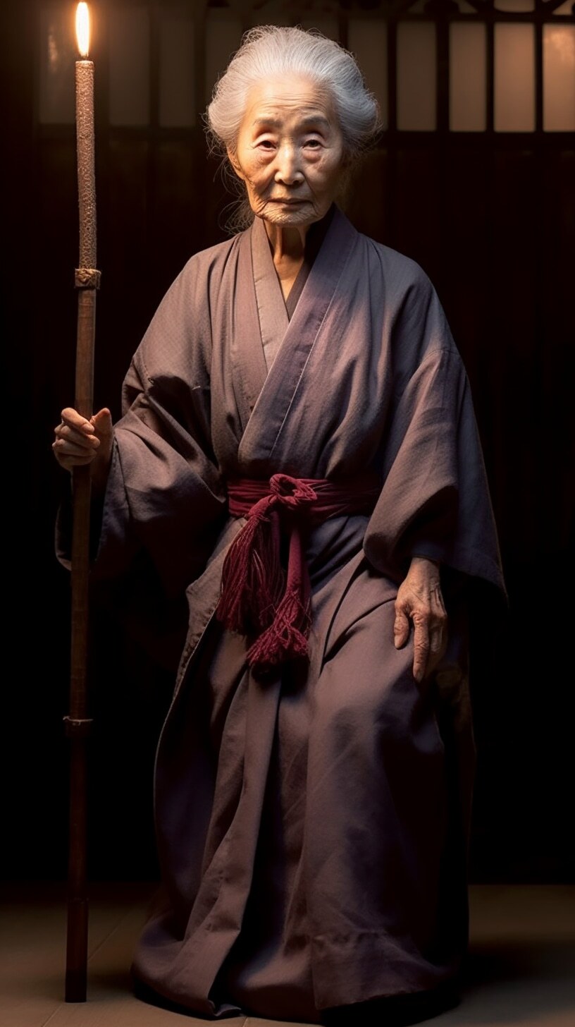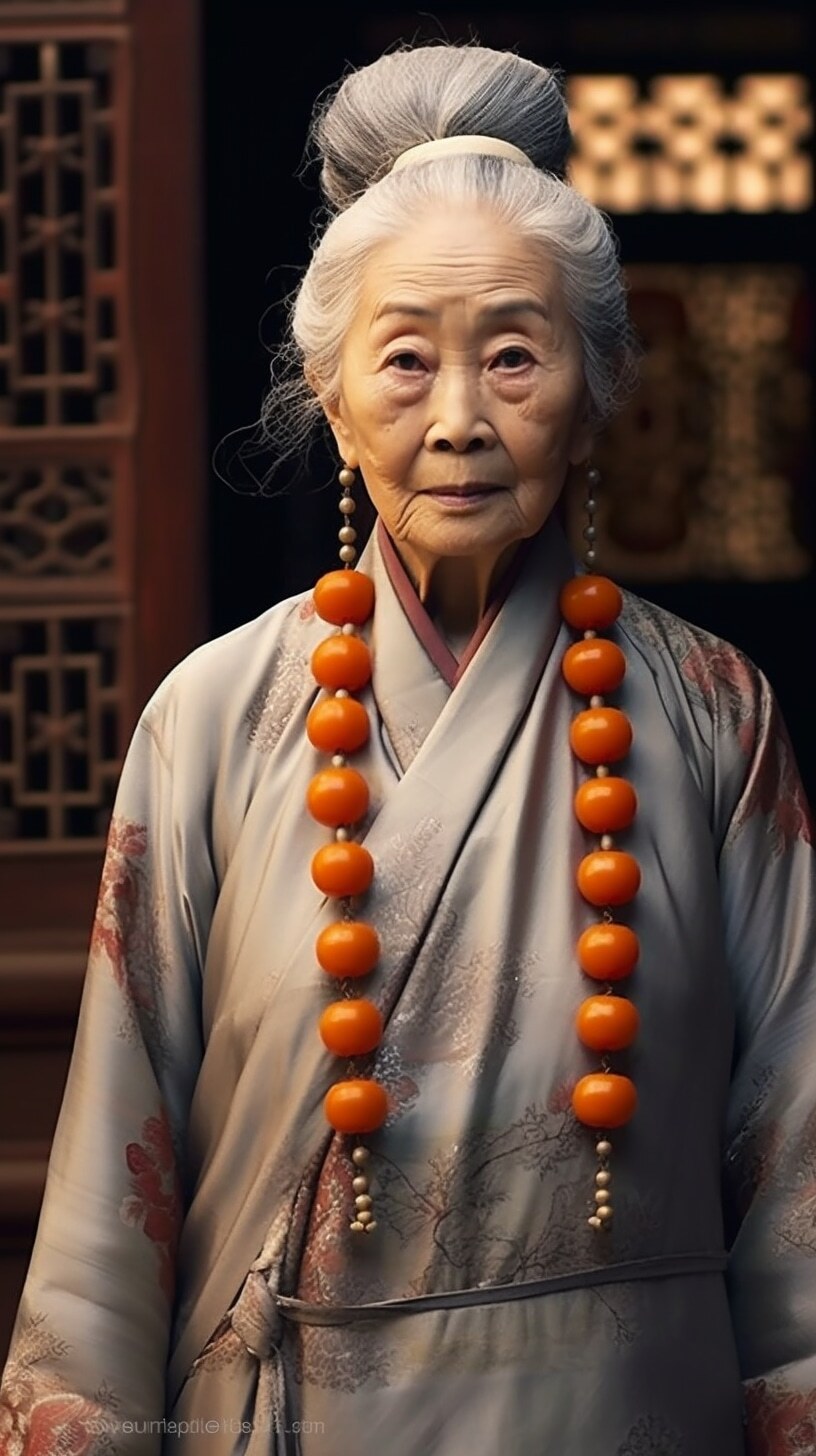 一个漂亮老婆婆,盘发头,满头白发,身穿麻布旧衣裳,中国风范,高高的鼻梁,拄着龙头拐杖,盘坐门前,正面全身照,正视前方,高清,白天,亮堂堂,背景屋前,超高清