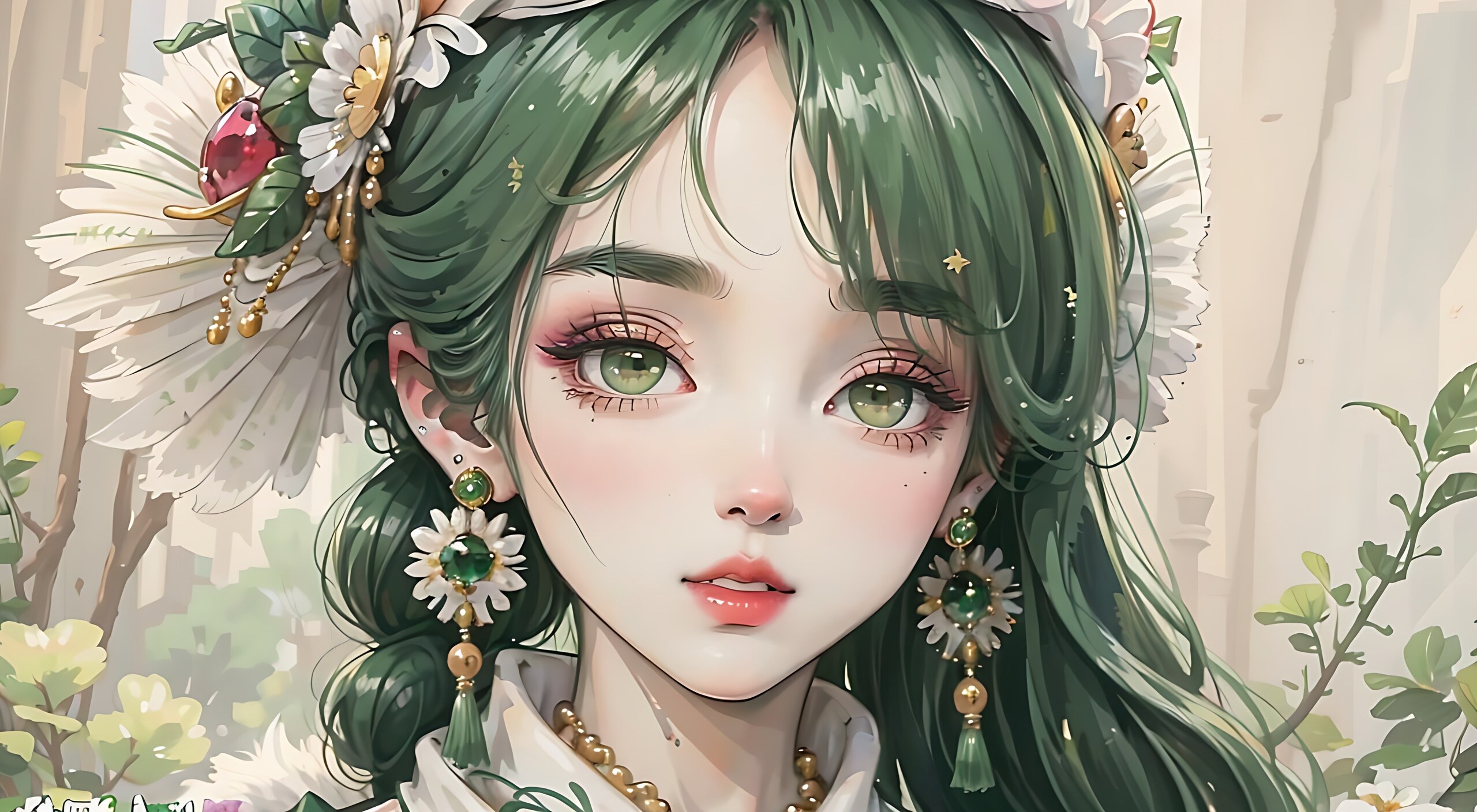 1个女孩,耳环,睫毛,宝石,绿色眼睛,绿色头发,帽子,帽子花,珠宝,嘴唇,看着观众,化妆,肖像,独奏,流苏,白色头饰