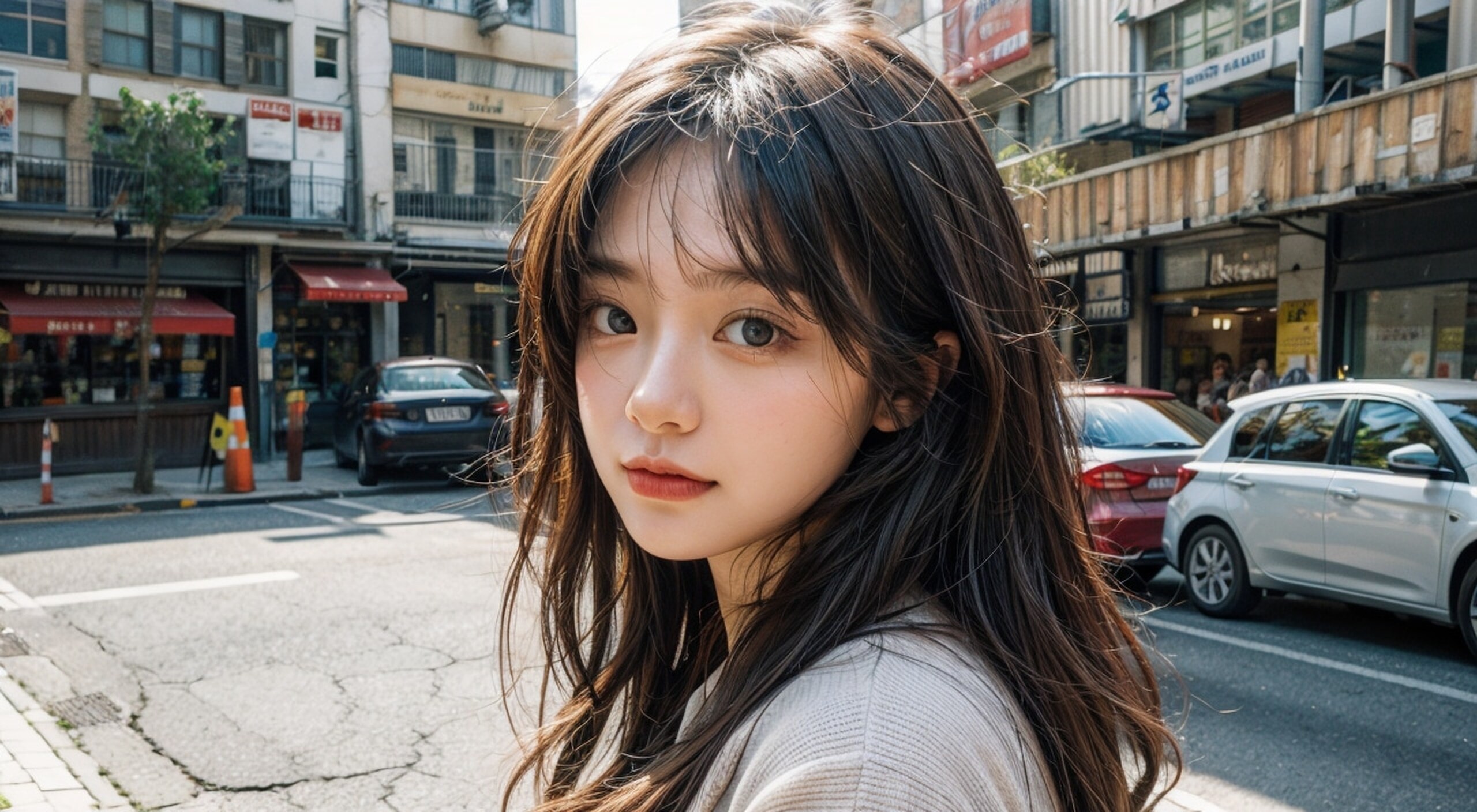 (穿着白色衬衣,领带,穿着卡其色格纹JK裙,女人,飘逸的长发,黑色的眼睛,雪白的皮肤,真实脸部,韩国人,穿着白色蕾丝透明长袜,详细,站姿,背景步行街,清纯型美女,全身镜头, 看着镜头,1girl,独奏,长发,看着观众,刘海,蓝眼睛,裙子,衬衫,发饰,长袖,蝴蝶结,珠宝,校服,白衬衫,灰色头发,百褶裙,耳环,分开的嘴唇,项链,有领衬衫,领结,黑色裙子,领子,嘴唇,灰色眼睛,黑色蝴蝶结,十字架,黑色领结,红唇, 高跟鞋,飘逸长发