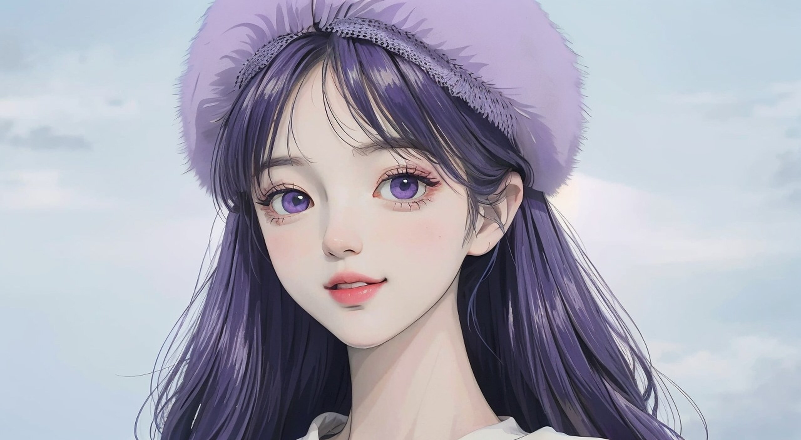 一个漂亮可爱的长发女孩,小萝莉,最高画质,精美画面,丁达尔效应,大眼睛,长睫毛,紫色毛衣裙,贝雷帽,完美五官,清晰脸庞,精致嘴唇,微笑,干净唯美的背景,温柔的光线,蓝色为主,简单化