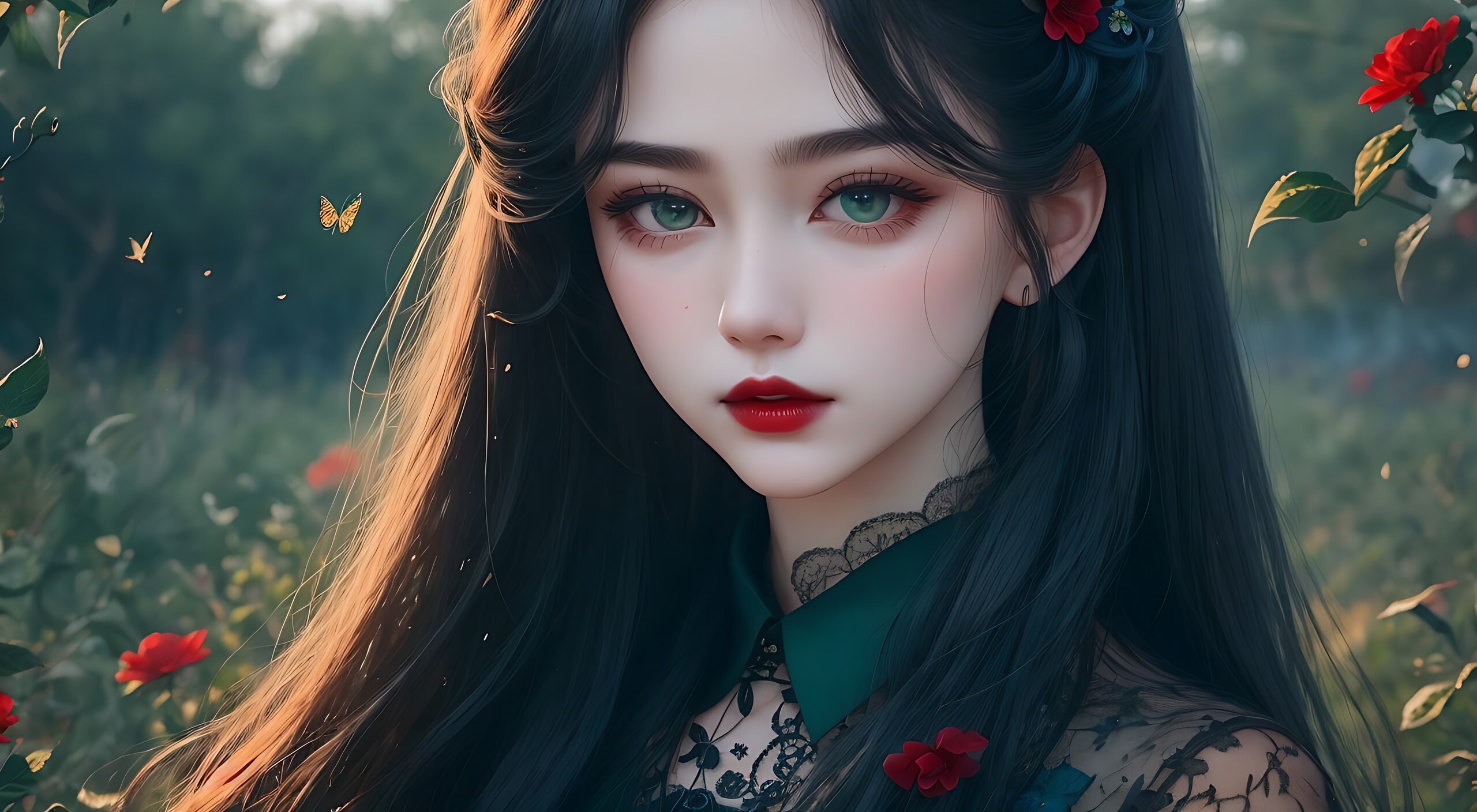 深绿色花 ,深蓝色蕾丝,红色唇釉,发簪垂下来,衣服华丽复杂,背景复杂繁琐,被风吹的飘起来,黑色长发,8K,氛围感,绝美神图,精致眼睛,绝美脸蛋,萝莉脸,飞蛾扑火,华丽
